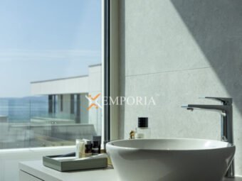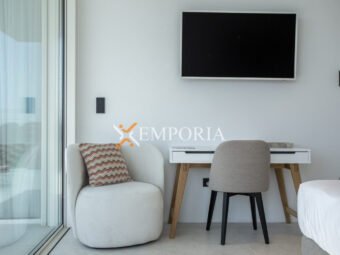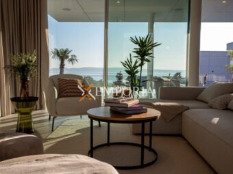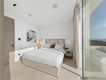 Im Obergeschoss (145,30 m2 brutto) befinden sich ein Flur, drei Schlafzimmer – jeweils mit eigenem Bad und Einbauschrank – sowie eine weitere teilweise überdachte Terrasse mit wunderschönem Meerblick.
