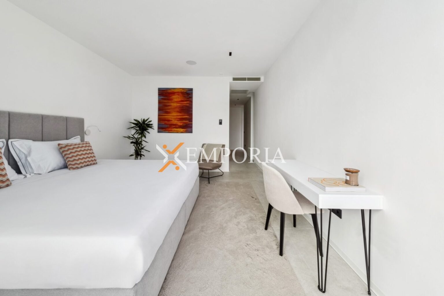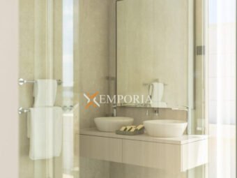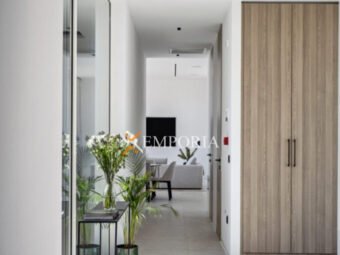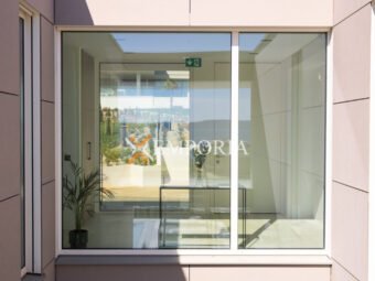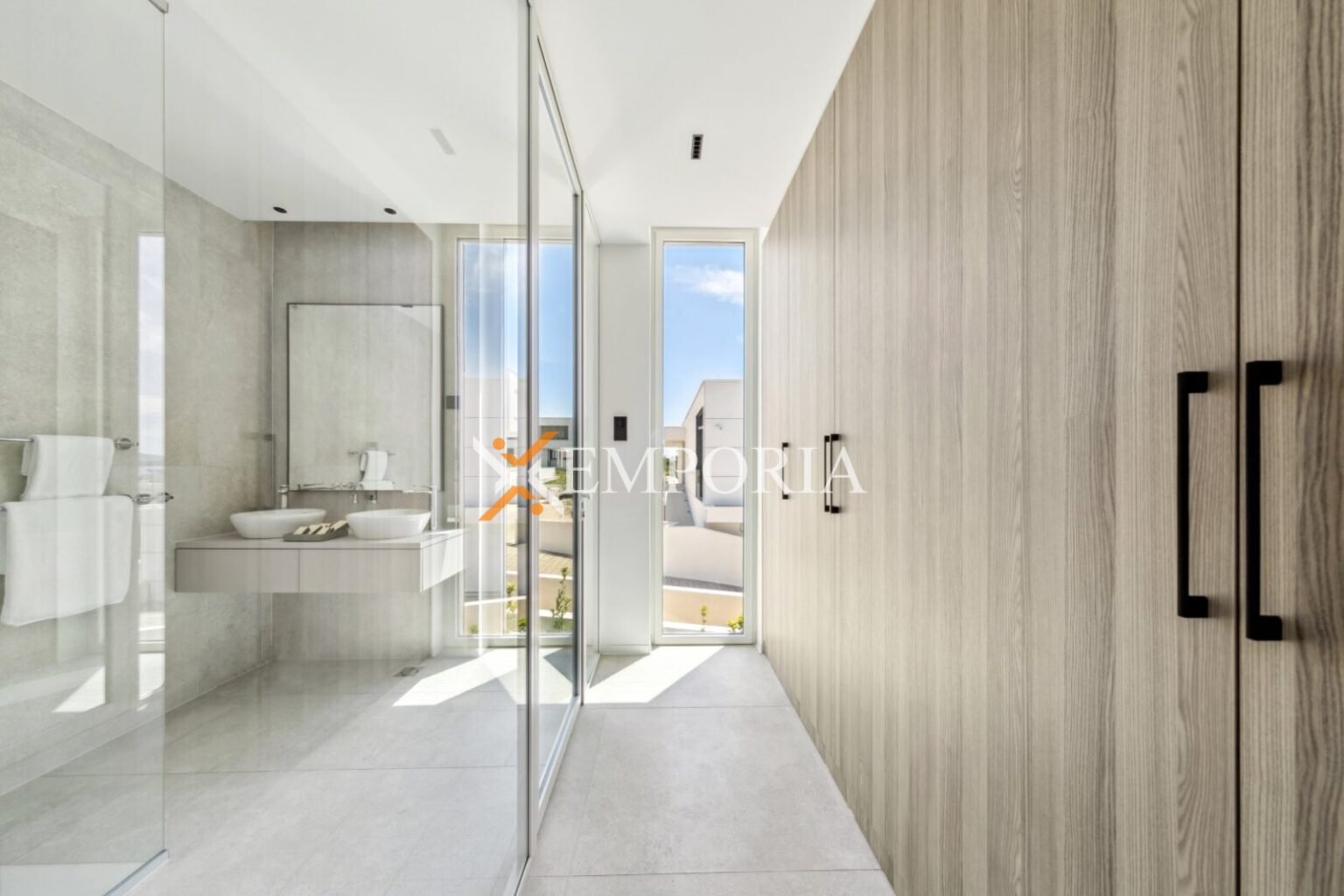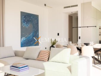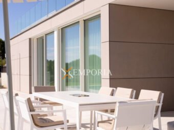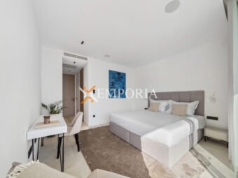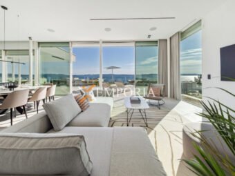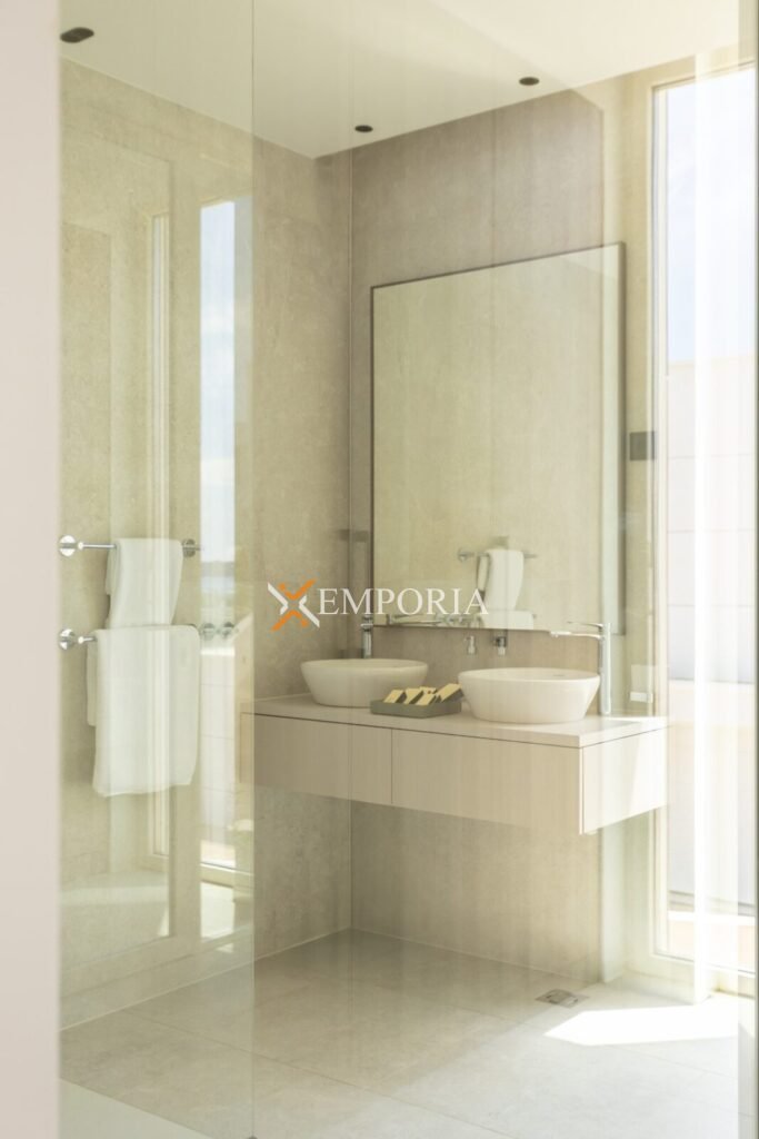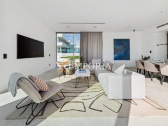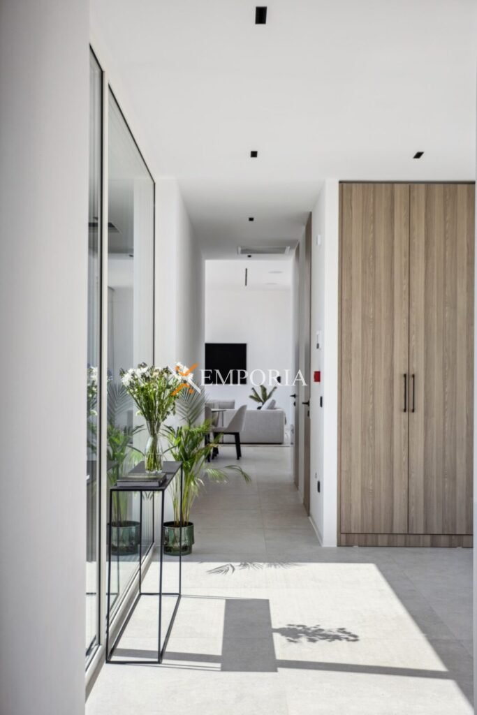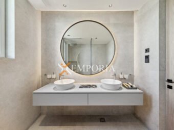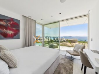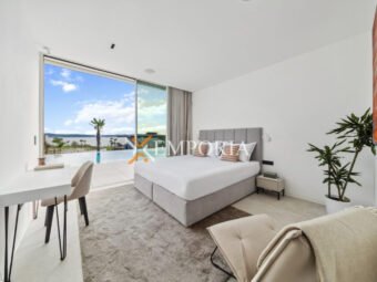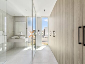 Im Obergeschoss (225,70 m2 brutto) befinden sich ein Flur, eine Abstellkammer, ein weiteres Gäste-WC, zwei weitere Schlafzimmer mit Bad und Kleiderschrank sowie eine offene Küche mit Ess- und Wohnbereich. Von dort aus gelangt man auf eine teilweise überdachte Terrasse mit herrlichem Meerblick und dem privaten Pool – ein echtes Highlight auf dieser Etage.