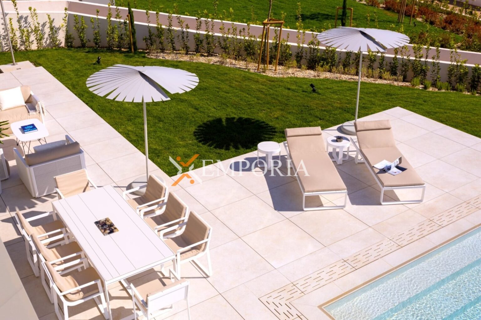 Das Erdgeschoss (209,80 m2 brutto) umfasst den Eingangsbereich, drei Schlafzimmer jeweils mit eigenem Bad und Kleiderschrank, ein Gäste-WC, einen Waschraum, Technikraum für den Pool, eine Garage für zwei Autos und eine teilweise überdachte Terrasse.