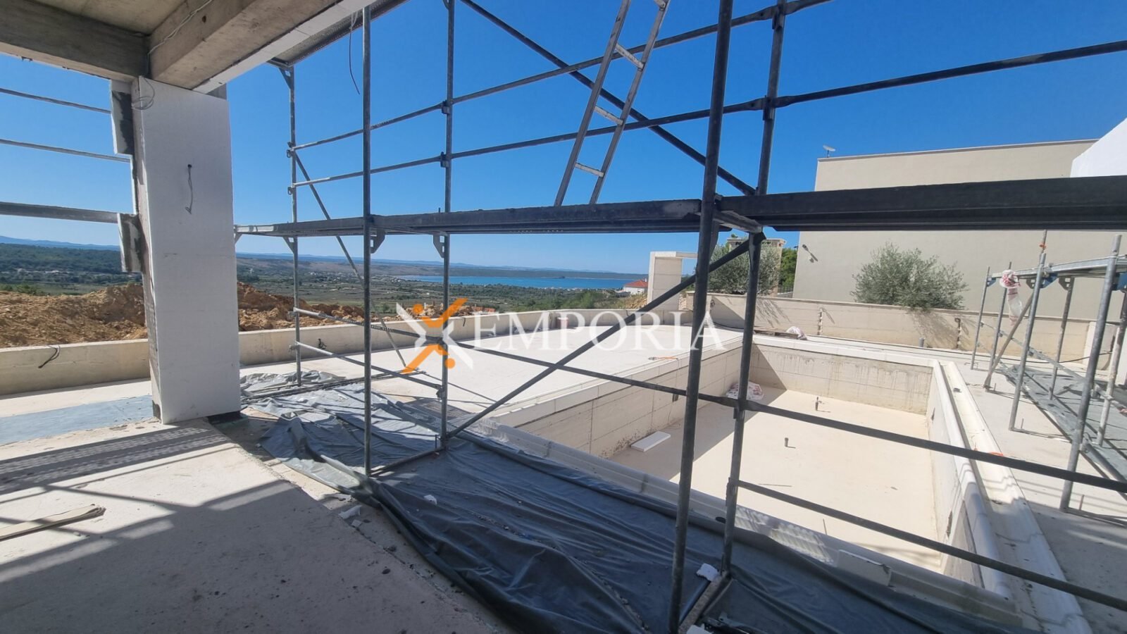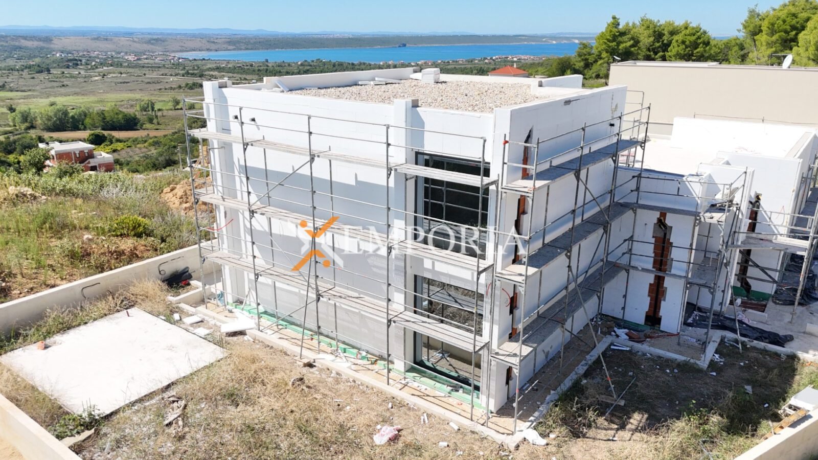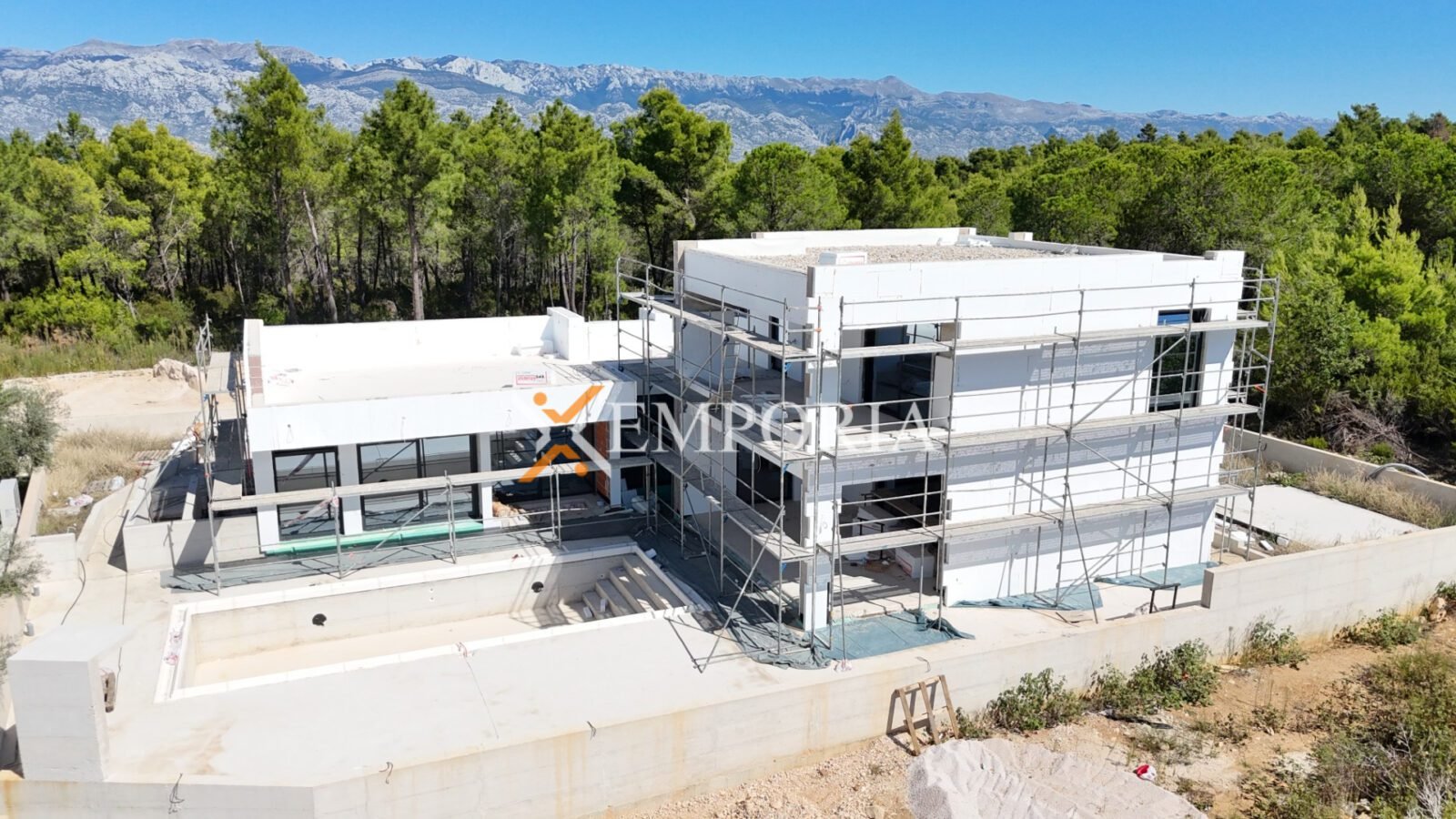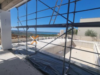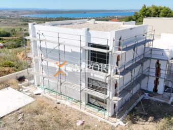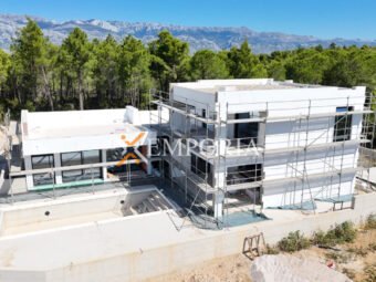 In Ražanac, 2,5 km vom Meer und 3 km vom Ortszentrum entfernt, steht ein moderner Neubau mit Pool zum Verkauf. Die Gesamtfläche beträgt 352,45 m² und das Grundstück misst 738 m². Die Wohnflächen verteilen sich auf Erdgeschoss und Obergeschoss.