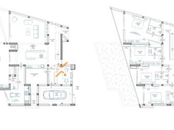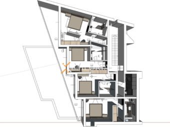 Das Obergeschoss besteht aus vier komfortablen Schlafzimmern, jeweils mit eigenem Bad. Eines der Schlafzimmer verfügt über einen eigenen begehbaren Kleiderschrank. Zusätzlich gibt es eine Waschküche, einen zentralen Flur mit Treppe und eine großzügige überdachte Terrasse. Die Gesamtfläche des Obergeschosses beträgt 144,24 m².