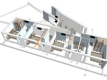 Das Obergeschoss bietet vier komfortable Schlafzimmer, jeweils mit eigenem Bad. Zwei Schlafzimmer verfügen über eigene begehbare Kleiderschränke. Außerdem gibt es eine Waschküche, einen zentralen Flur mit Treppe und eine große überdachte Terrasse, die ideal für entspannte Stunden im Freien ist. Die Gesamtfläche des Obergeschosses beträgt 150,66 m².