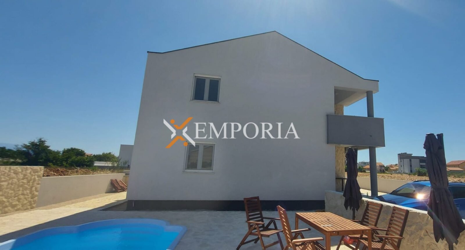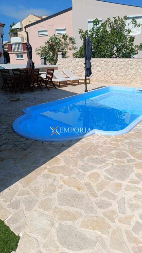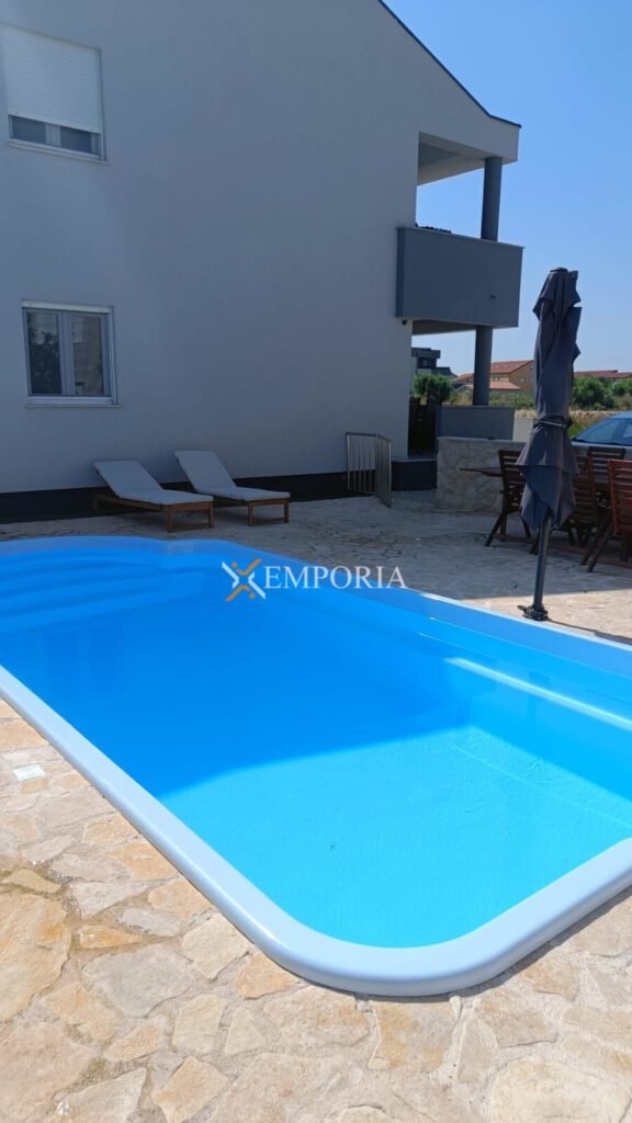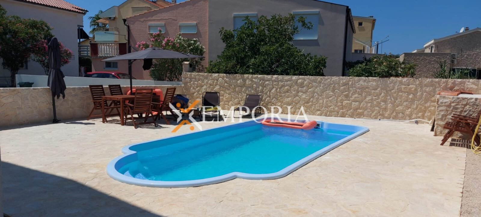 In ruhiger Lage in Privlaka, nur 240 m vom Meer und 200 m vom Ortszentrum entfernt, steht ein modernes Haus mit insgesamt fünf Wohneinheiten, privatem Pool und großzügigem Garten zum Verkauf. Das Grundstück hat eine Fläche von 575 m², und die gesamte netto nutzbare Wohnfläche des Hauses mit Pool beträgt 297,14 m².