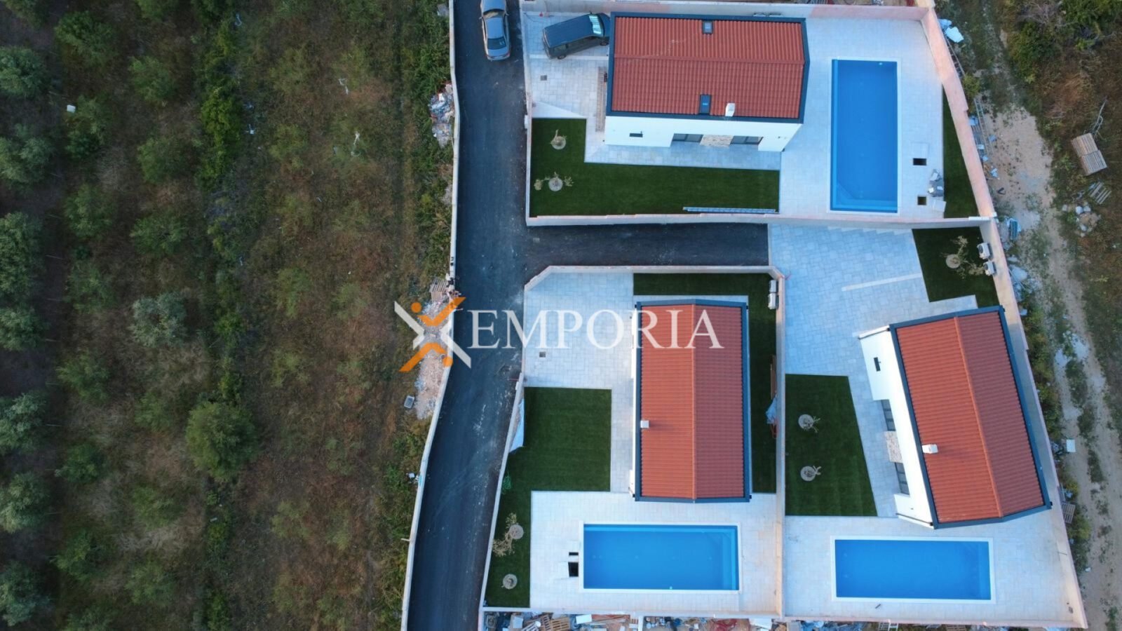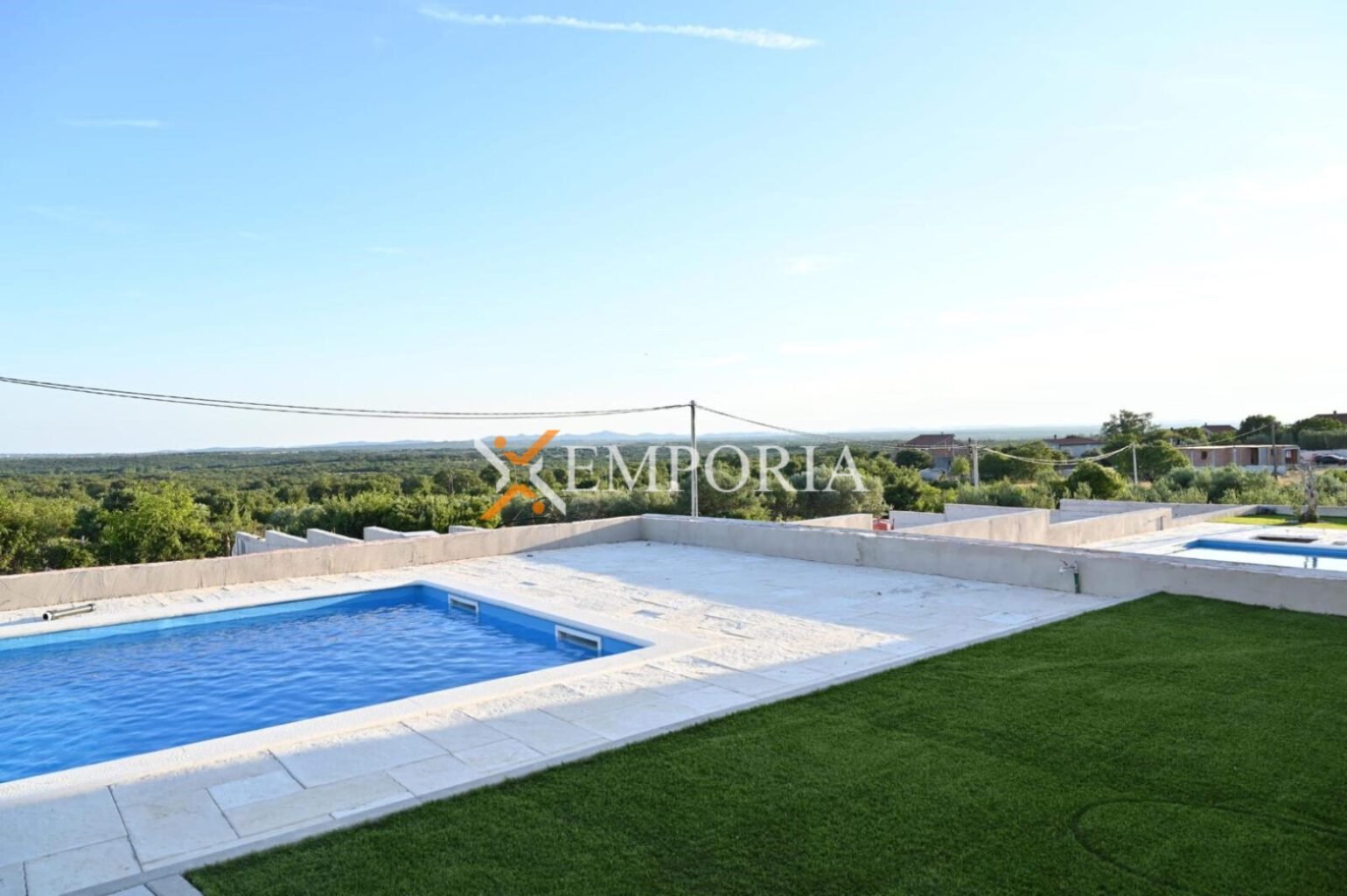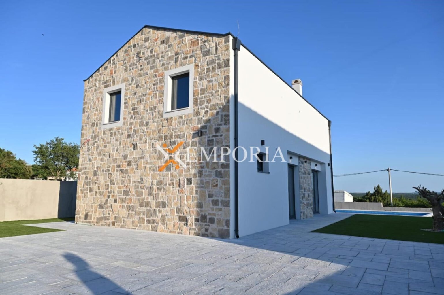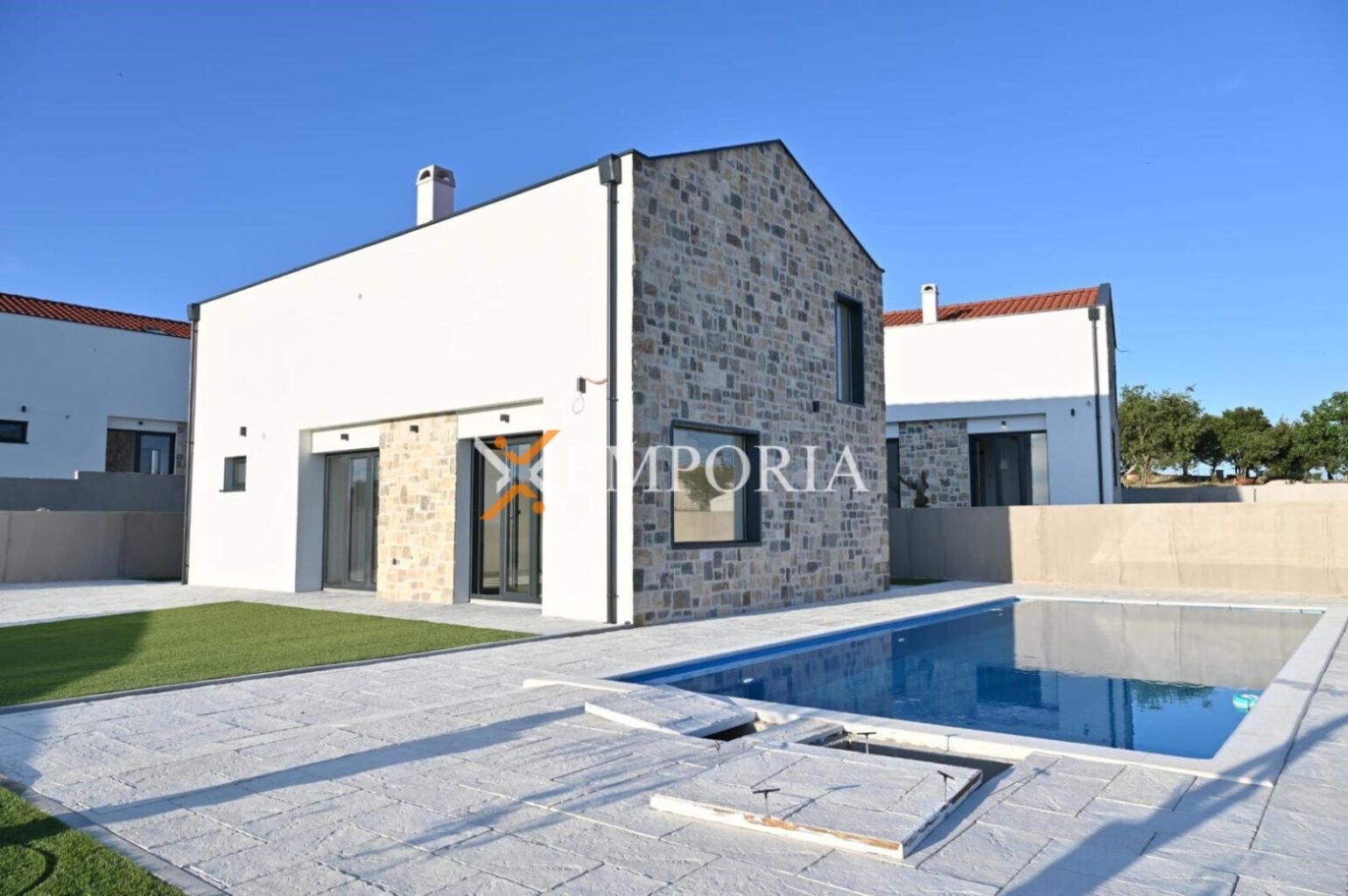 Im ruhigen Ort Visočane, Gemeinde Poličnik, steht ein modernes Neubauhaus mit Pool zum Verkauf, nur 6 km vom Meer und 300 m vom Ortszentrum entfernt. Das Haus erstreckt sich über zwei Etagen und bietet einen sorgfältig geplanten Grundriss für komfortables Wohnen. Im Erdgeschoss befinden sich ein Flur, ein Schlafzimmer mit eigenem Badezimmer, eine Küche mit Ess- und Wohnbereich, ein zusätzliches WC sowie ein Waschraum. Eine Innentreppe führt in das Obergeschoss, wo sich ein Flur und zwei Schlafzimmer befinden, jeweils mit eigenem Badezimmer. Die Netto-Wohnfläche beträgt 102,53 m², während das Grundstück 401 m² groß ist. Der Außenbereich bietet einen schön angelegten Garten, einen 40 m² großen Pool mit Folienauskleidung und Vorbereitung für Heizung sowie zwei Parkplätze.