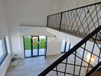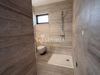 Das Haus wurde mit hochwertigen Materialien gebaut – Ziegel-Thermoblock, PVC-Fenster mit Doppelverglasung, Fassade mit 10 cm Styropordämmung und dekorativen Steinelementen. Die Böden sind mit Fliesen und Laminat belegt, und im gesamten Haus ist elektrische Fußbodenheizung installiert. Vier Klimaanlagen sind vorhanden (im Wohnzimmer und in allen Schlafzimmern), zudem verfügt das Haus über einen Kaminanschluss. Das Dach ist neu und geneigt, die Entwässerung erfolgt über eine biologische Kläranlage. Die Zufahrt ist privat und asphaltiert. Der Energieausweis A garantiert eine hohe Energieeffizienz.