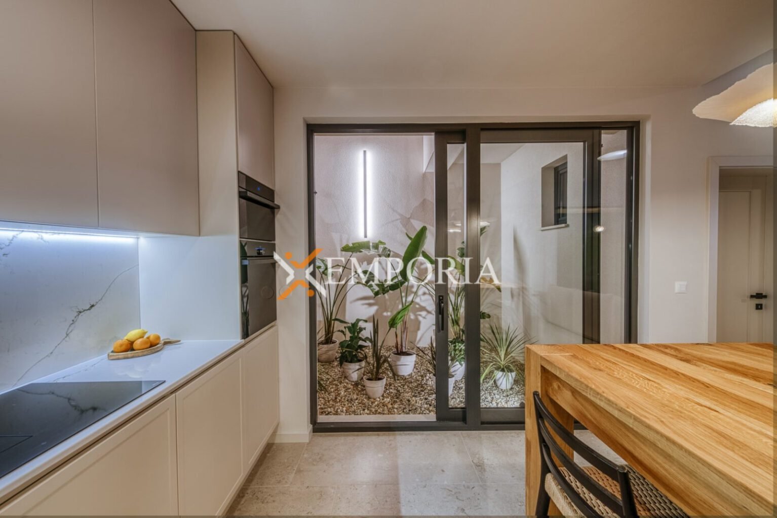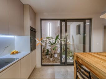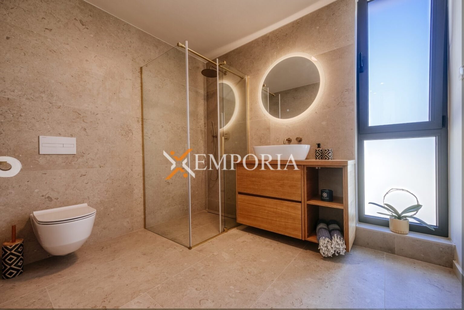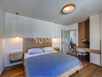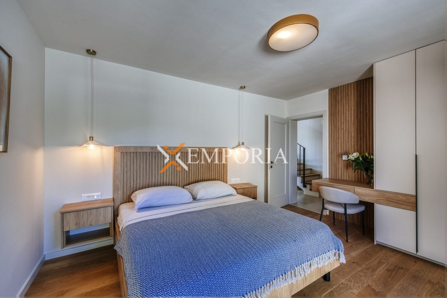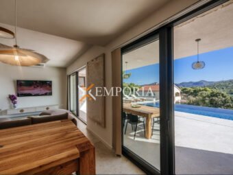 Das Erdgeschoss umfasst eine großzügige Küche, die mit dem Essbereich und dem Wohnzimmer verbunden ist, ein Schlafzimmer, ein Badezimmer, einen Abstellraum sowie einen kleinen begrünten Innenhof. Der Außenbereich bietet einen Hauswirtschafts- und Waschraum, ein zusätzliches WC, eine Terrasse, eine Loggia, eine Sonnenterrasse und den Pool. Im Obergeschoss befinden sich zwei Schlafzimmer, eines mit eigenem Bad, ein weiteres Badezimmer sowie zwei Terrassen mit Meerblick. Zum Haus gehören außerdem fünf Stellplätze.