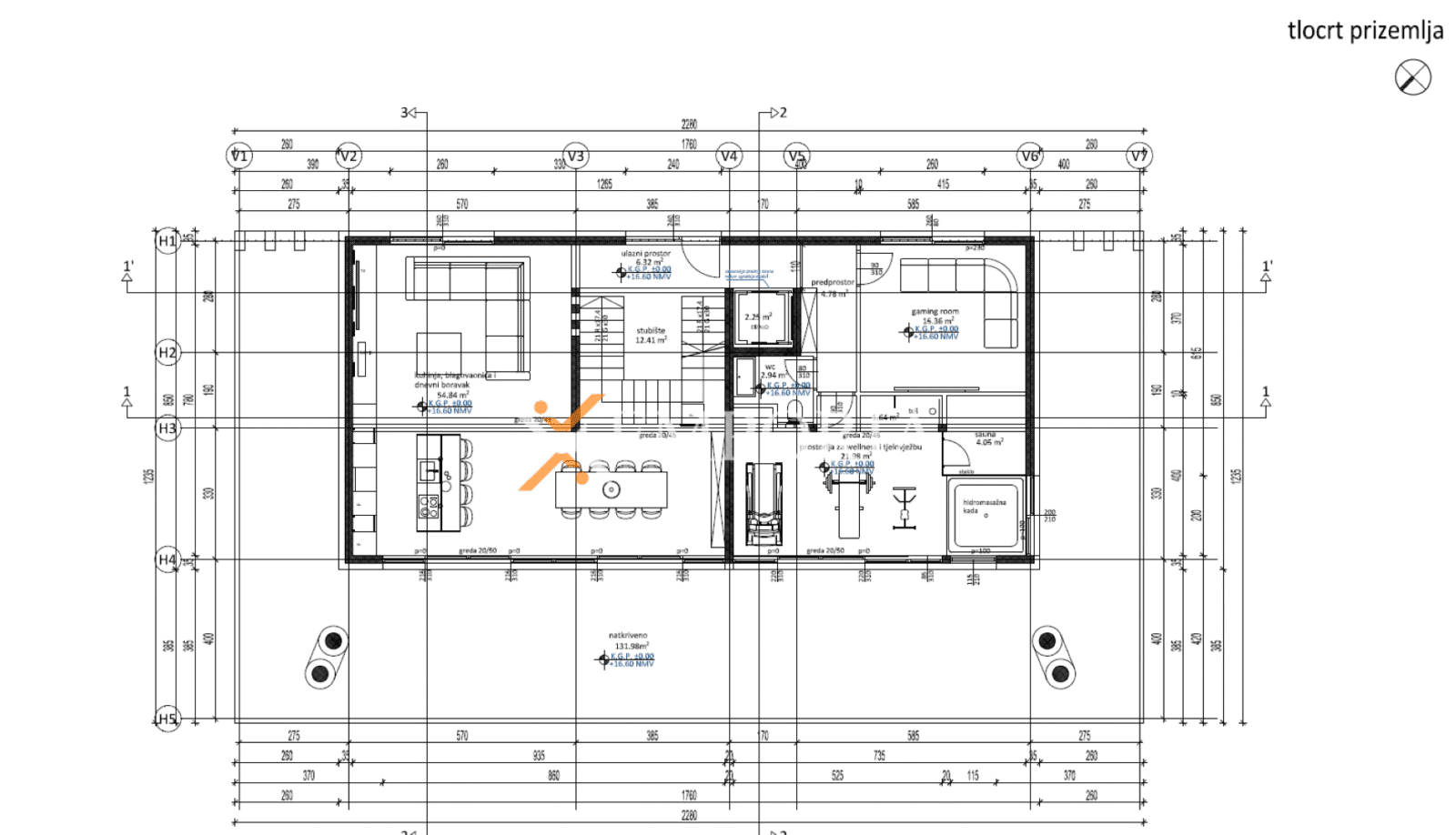 Die gesamte Netto-Nutzfläche des Hauses, berechnet nach Koeffizienten einschließlich Pools und Garage beträgt 560,40 m2.