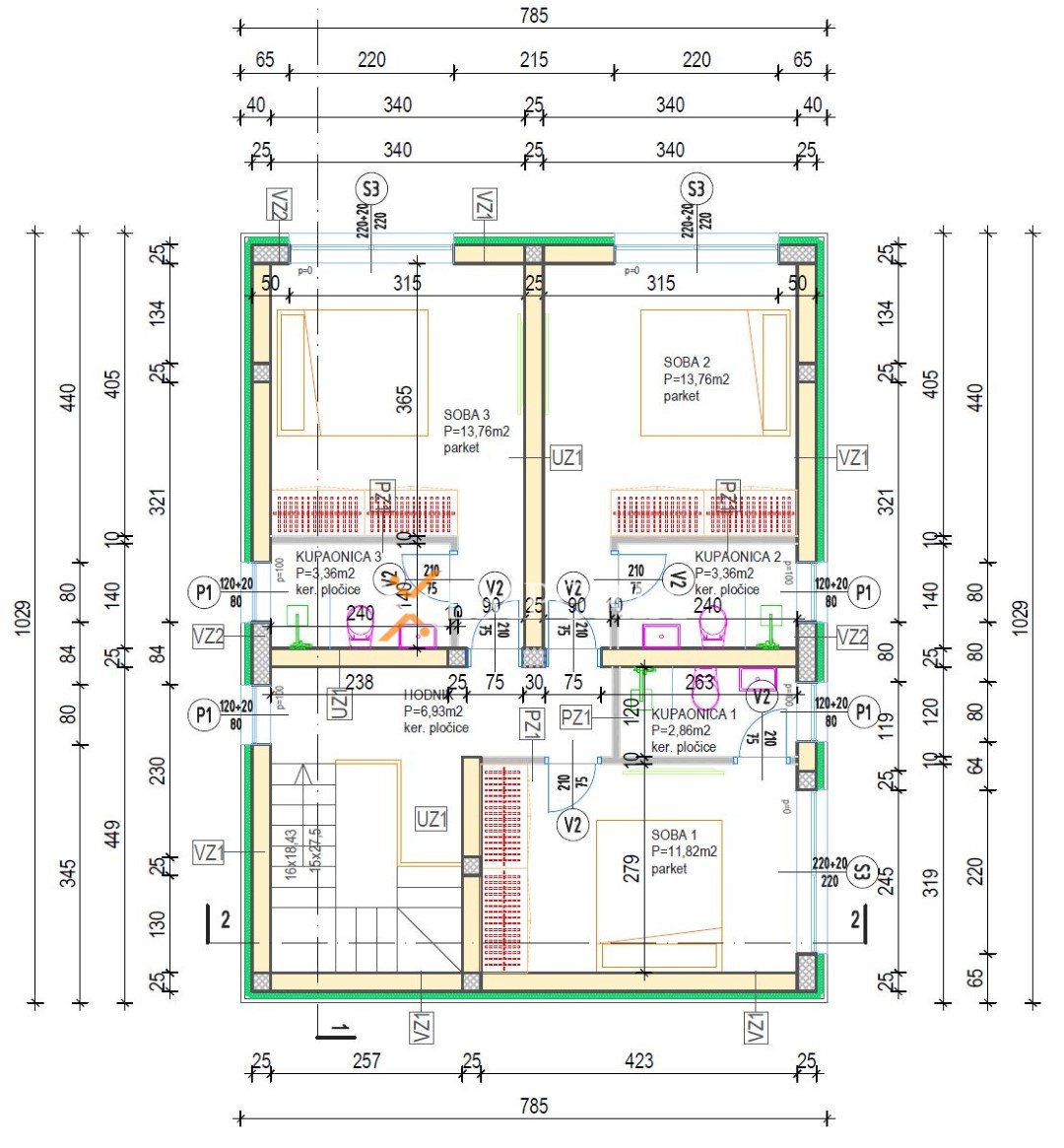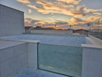 Im ersten Stock befinden sich ein Flur und drei Schlafzimmer, jedes mit eigenem Badezimmer. Die Fläche des ersten Stocks beträgt 55,85 m². Im zweiten Stock befinden sich der Zugang zur Terrasse, eine Küche auf der Dachterrasse, eine offene Terrasse sowie ein Pool. Die Fläche des zweiten Stocks beträgt 54,92 m².