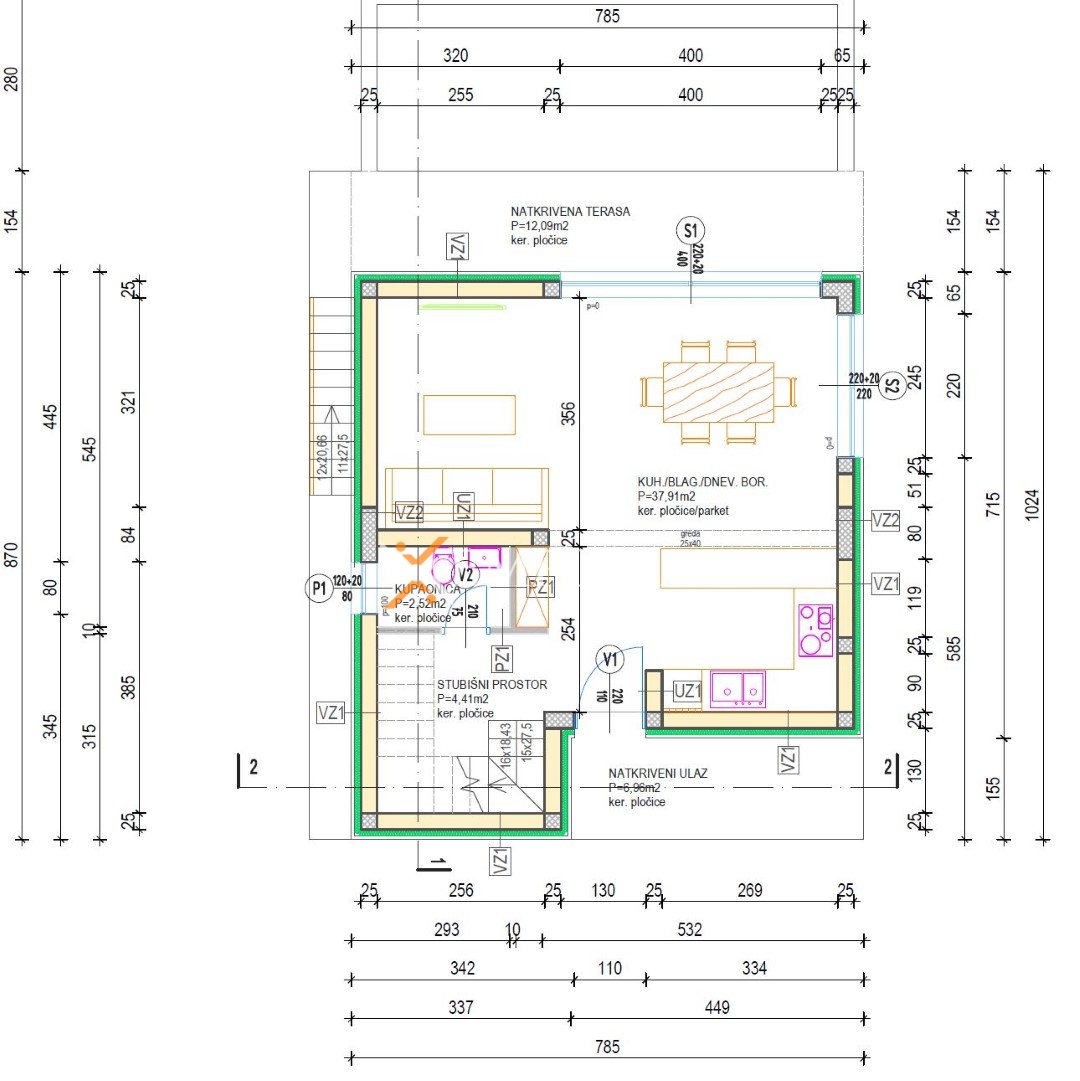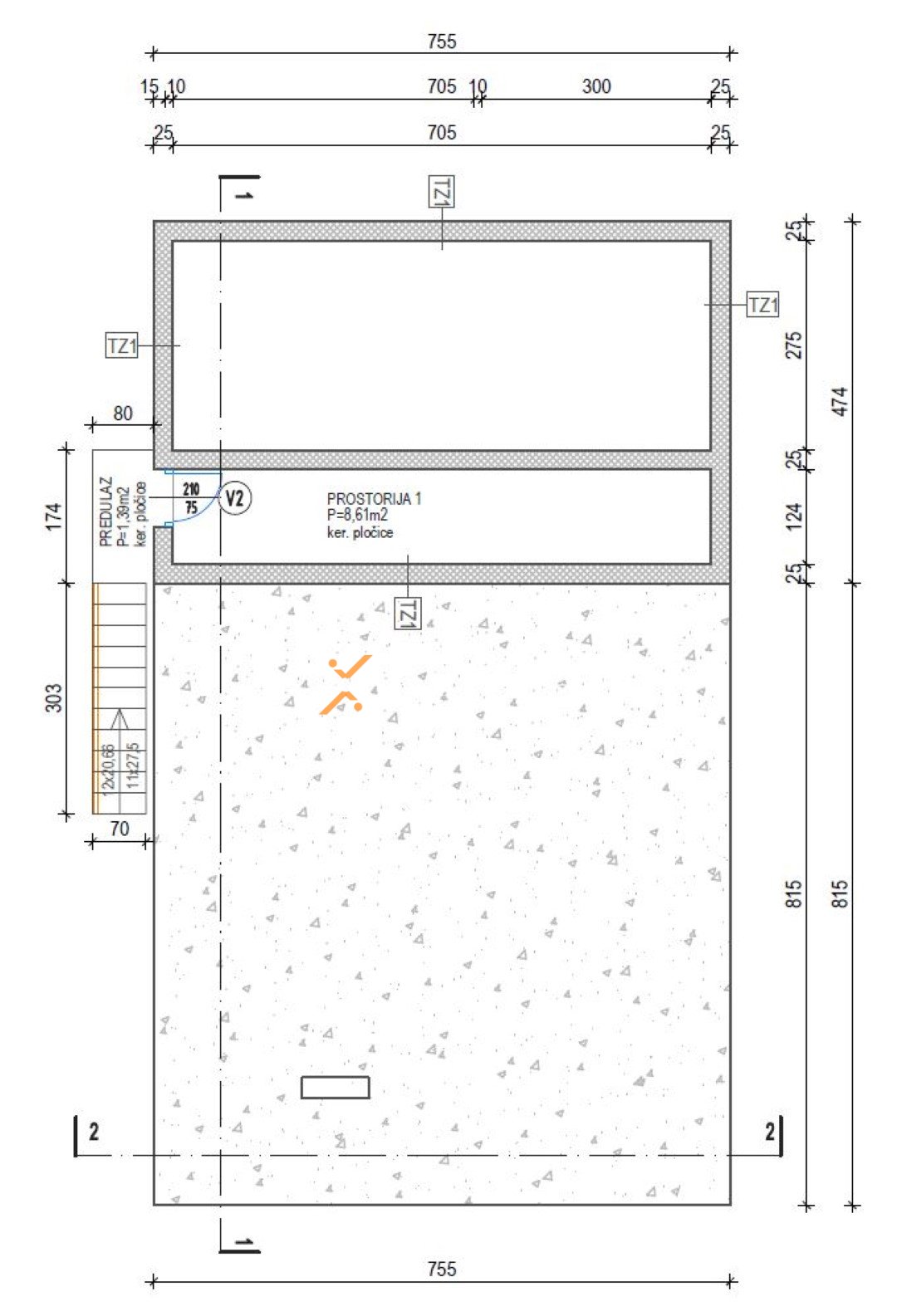 Im Untergeschoss befindet sich ein Keller mit einer Fläche von 10,00 m². Im Erdgeschoss befinden sich ein überdachter Eingang, ein WC, eine Küche mit Essbereich und Wohnzimmer, eine Treppe sowie eine überdachte Terrasse. Die Fläche des Erdgeschosses beträgt 63,89 m².