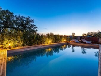 Im Außenbereich befindet sich ein Pool mit 32 m² Fläche und Folie. Die Gesamtfläche inklusive Pool beträgt 156,22 m², während die Grundstücksfläche 615 m² beträgt.