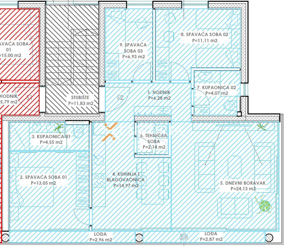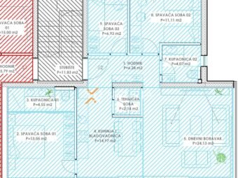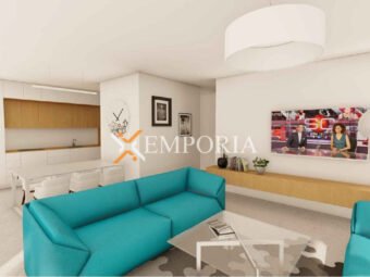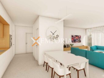 Konstruktion mit Betonwand und gemauertem Thermoblock. Die Bodenbeläge sind Fliesen und Parkett. Als Wärmedämmung wird an der Fassade Styropor mit einer Dicke von 8 cm angebracht. Die Fenster sind aus Aluminium mit Moskitonetzen und Rollläden. In der gesamten Wohnung ist eine wassergeführte Fußbodenheizung über Wärmepumpen installiert. Die Räumlichkeiten werden über Deckengeräte, ebenfalls über Wärmepumpen, klimatisiert. Darüber hinaus ist die Eingangstür der Wohnung einbruchsicher und feuerfest.