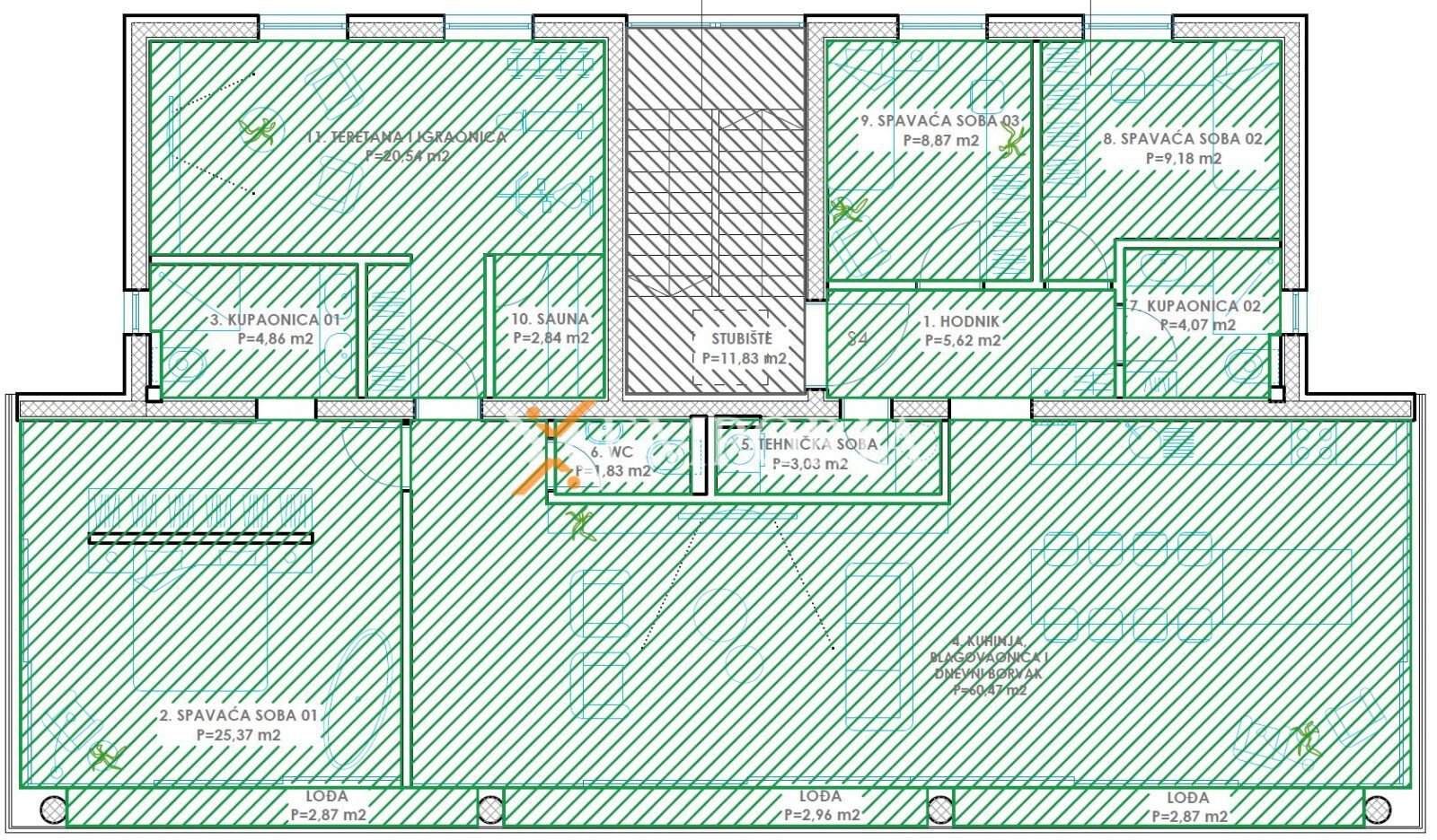 Dies ist eine Wohnung im zweiten Stock. Die Raumaufteilung besteht aus einem Flur, einem Schlafzimmer mit Bad, zwei weiteren Schlafzimmern, einem Badezimmer, einer Waschküche, WC, einer Küche mit Ess- und Wohnzimmer, Fitness und Spielraum, Sauna, sowie einer Loggia. Die Fläche des Beschriebenen beträgt 153,21 m2. Zur Wohnung gehört außerdem ein Garagenstellplatz, ein Stellplatz im Freien, und ein Abstellraum im Untergeschoss.