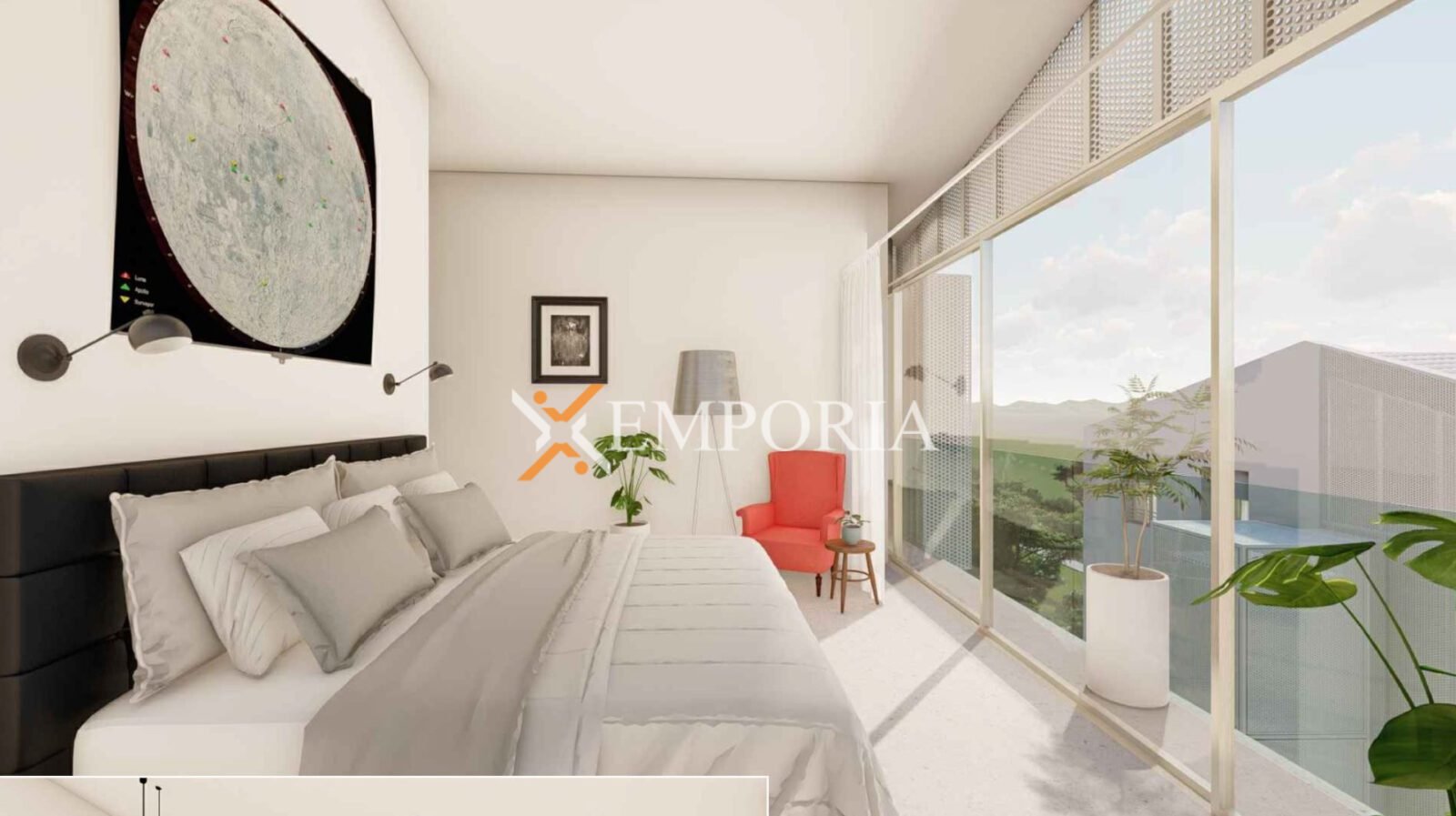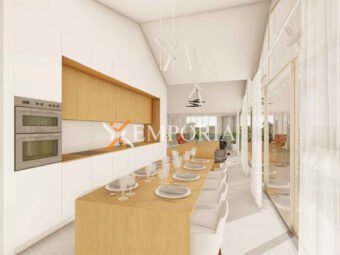 Konstruktion mit Betonwand und gemauertem Thermoblock. Die Bodenbeläge sind Fliesen und Parkett. Als Wärmedämmung wird an der Fassade Styropor mit einer Dicke von 8 cm angebracht. Die Fenster sind aus Aluminium mit Moskitonetzen und Rollläden. In der gesamten Wohnung ist eine wassergeführte Fußbodenheizung über Wärmepumpen installiert. Die Räumlichkeiten werden über Deckengeräte, ebenfalls über Wärmepumpen, klimatisiert. Darüber hinaus ist die Eingangstür der Wohnung einbruchsicher und feuerfest.