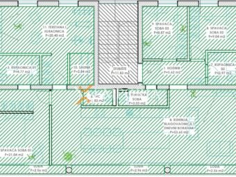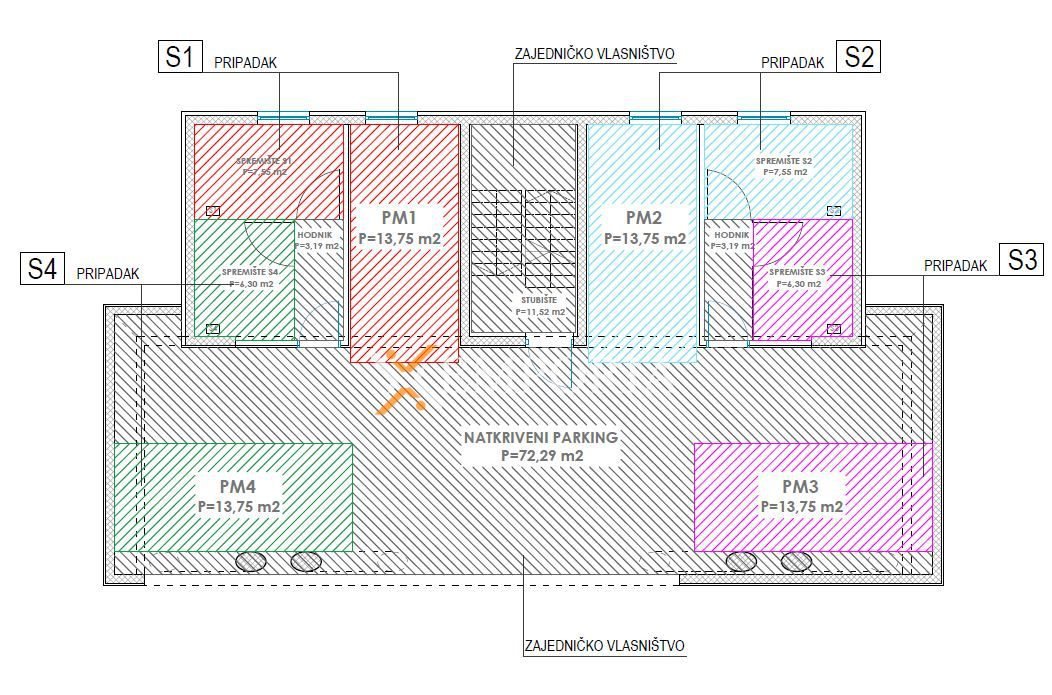 Dies ist eine Wohnung im zweiten Stock. Die Raumaufteilung besteht aus einem Flur, einem Schlafzimmer mit Bad, zwei weiteren Schlafzimmern, einem Badezimmer, einer Waschküche, WC, einer Küche mit Ess- und Wohnzimmer, Fitness und Spielraum, Sauna, sowie einer Loggia. Die Fläche des Beschriebenen beträgt 141,12 m2. Zur Wohnung gehört außerdem ein Garagenstellplatz, ein Stellplatz im Freien, und ein Abstellraum im Untergeschoss.
