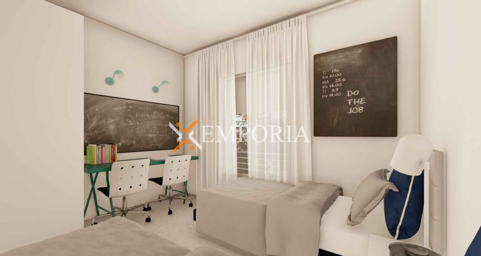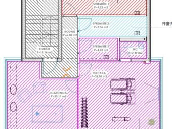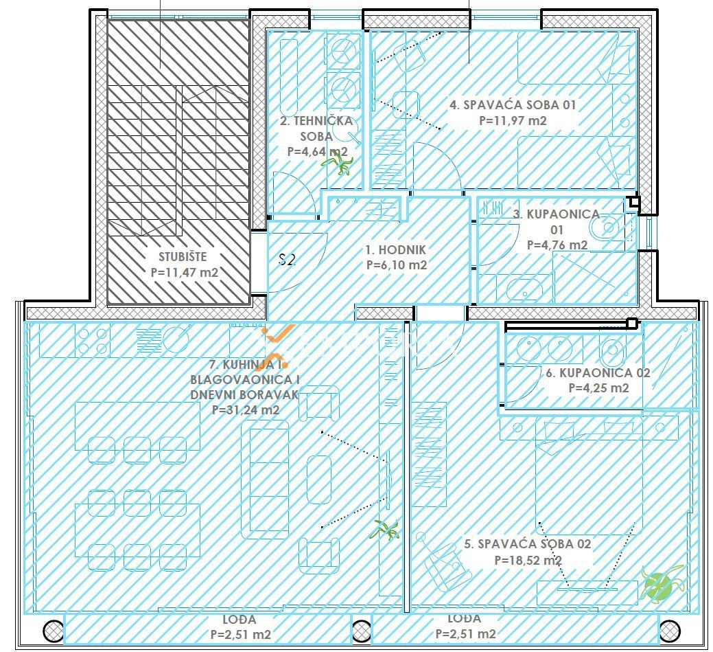 Dies ist die einzige Wohnung im ersten Stock. Die Raumaufteilung besteht aus einem Flur, einem Schlafzimmer mit Bad, einem weiteren Schlafzimmer, einem Badezimmer, einer Waschküche, einer Küche mit Ess- und Wohnzimmer sowie einer Loggia. Die Fläche des Beschriebenen beträgt 85,26 m2. Zur Wohnung gehören außerdem zwei Stellplätze im Freien und ein Abstellraum im Untergeschoss.