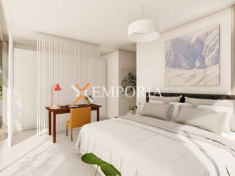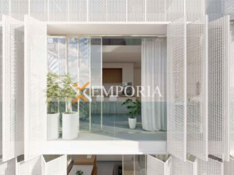 Konstruktion mit Betonwand und gemauertem Thermoblock. Die Bodenbeläge sind Fliesen und Parkett. Als Wärmedämmung wird an der Fassade Styropor mit einer Dicke von 8 cm angebracht. Die Fenster sind aus Aluminium mit Moskitonetzen und Rollläden. In der gesamten Wohnung ist eine wassergeführte Fußbodenheizung über Wärmepumpen installiert. Die Räumlichkeiten werden über Deckengeräte, ebenfalls über Wärmepumpen, klimatisiert. Darüber hinaus ist die Eingangstür der Wohnung einbruchsicher und feuerfest.