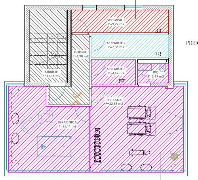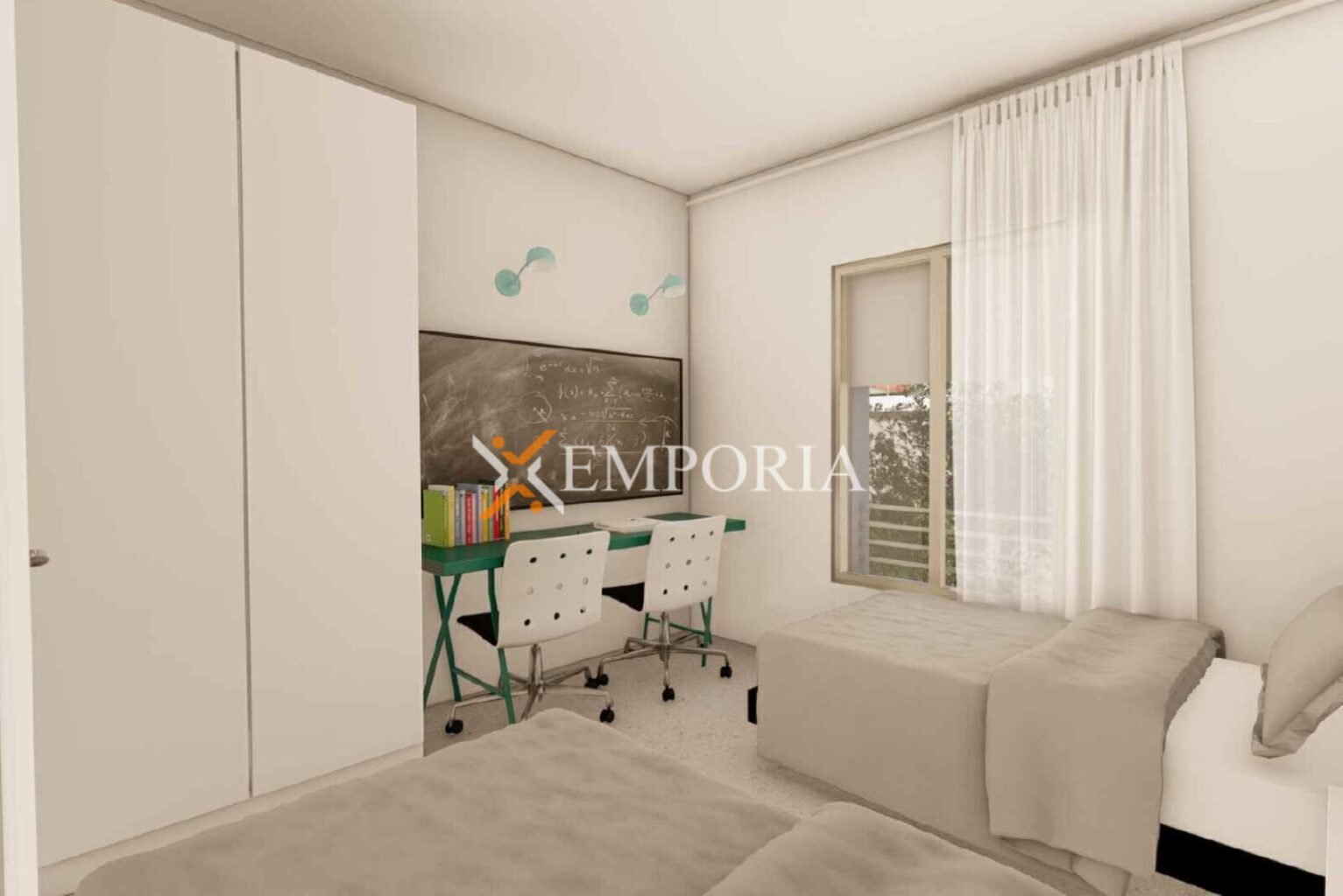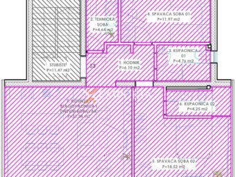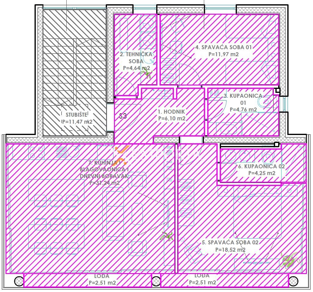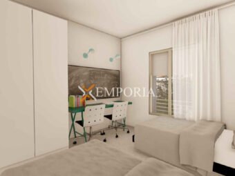 Dies ist die einzige Wohnung im zweiten Stock. Die Raumaufteilung besteht aus einem Flur, einem Schlafzimmer mit Bad, einem weiteren Schlafzimmer, einem Badezimmer, einer Waschküche, einer Küche mit Ess- und Wohnzimmer sowie einer Loggia. Die Fläche des Beschriebenen beträgt 85,26 m2. Zur Wohnung gehören außerdem zwei Stellplätze im Freien und ein Abstellraum, Spielraum, Fitnessraum und WC im Untergeschoss.