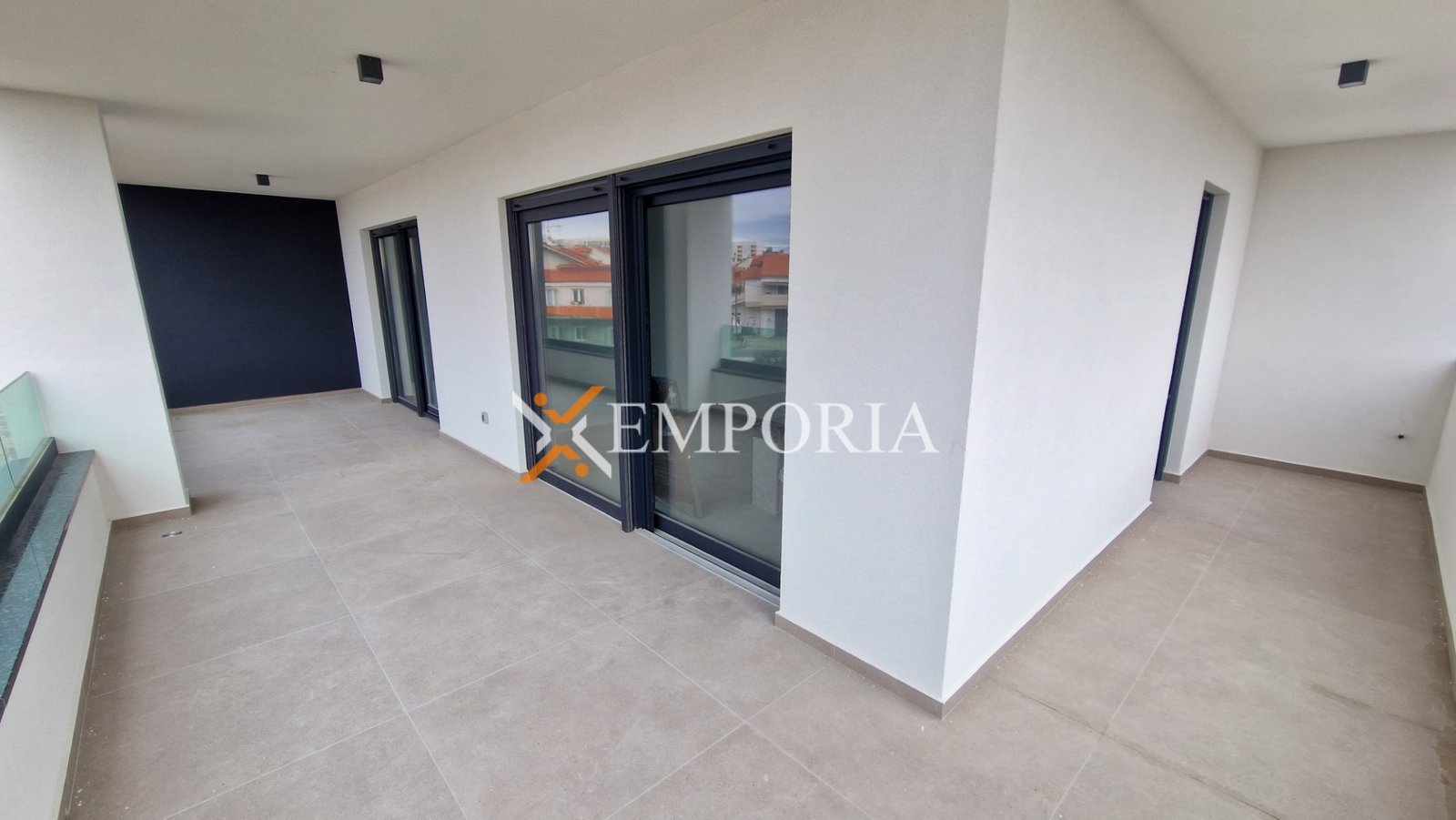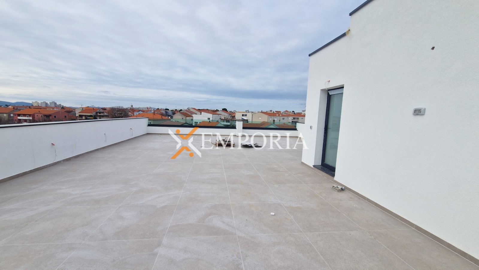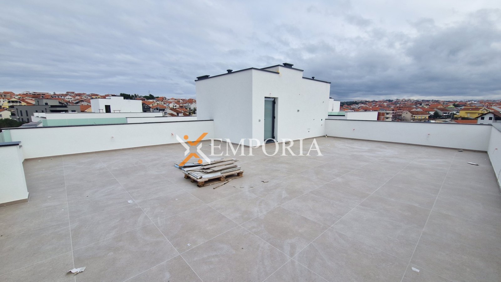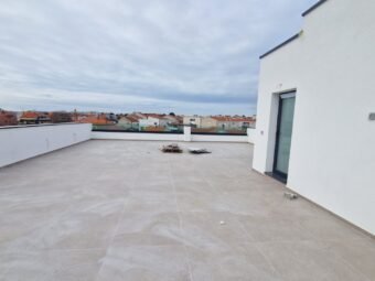 Die Raumaufteilung besteht aus einem Flur, zwei Schlafzimmern, einem Schlafzimmer mit Badezimmer, einem Badezimmer, einem WC, einer Küche mit Essbereich und Wohnzimmer sowie einer Loggia (105,50 m2 netto). Vom Treppenhaus gelangt man auf eine Dachterrasse mit einer Fläche von 120,18 m2. Die netto Nutzfläche der beschriebenen Räume beträgt 135,54 m2.