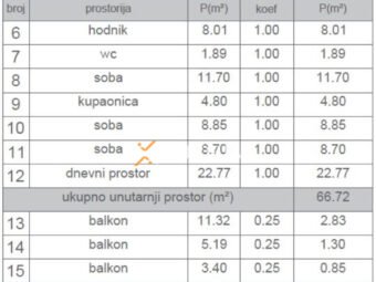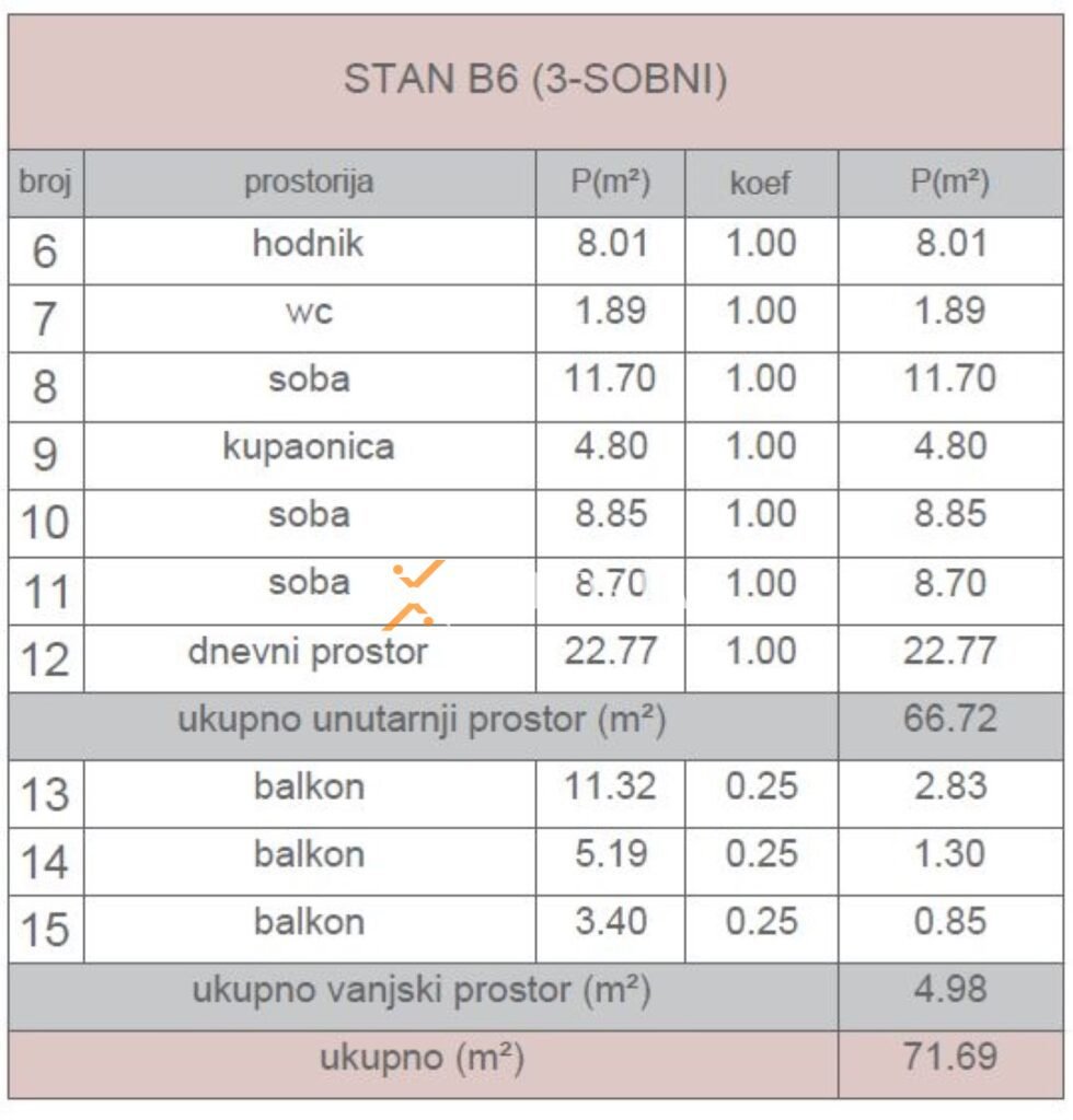 Die Raumaufteilung umfasst einen Flur, drei Schlafzimmer, ein Badezimmer, ein WC, eine Küche mit Essbereich und Wohnzimmer sowie drei unbedeckte Terrassen. Die Nettonutzfläche der beschriebenen Räumlichkeiten beträgt 71,69 m2.