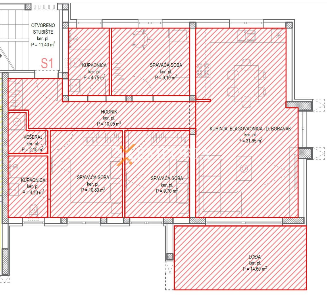 Die Raumaufteilung umfasst einen Flur, zwei Schlafzimmer, ein weiteres Schlafzimmer mit eigenem Bad, ein zusätzliches Badezimmer, einen Waschraum sowie eine Küche mit Ess- und Wohnzimmer. Vom Wohnbereich aus gelangt man auf die Loggia mit wunderschönem Meerblick.