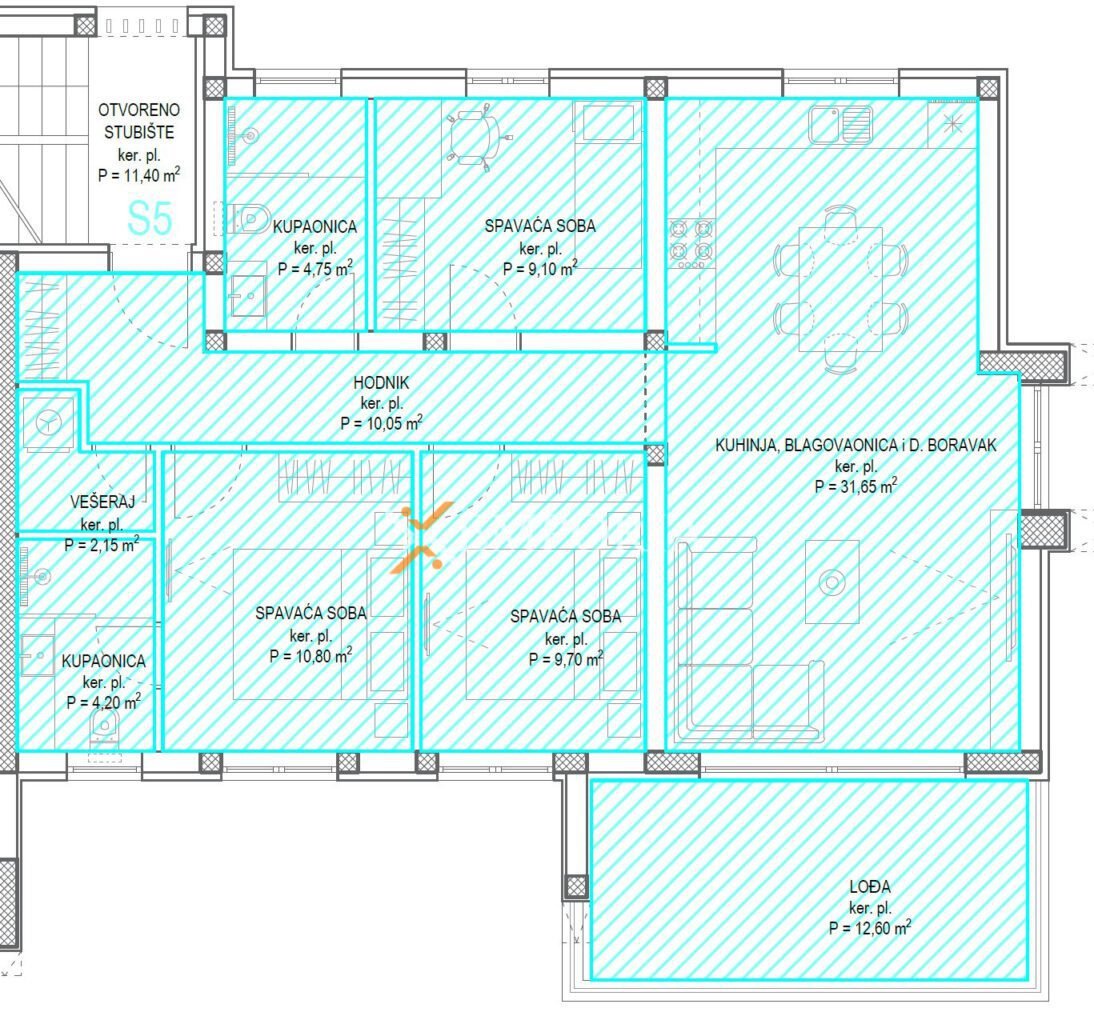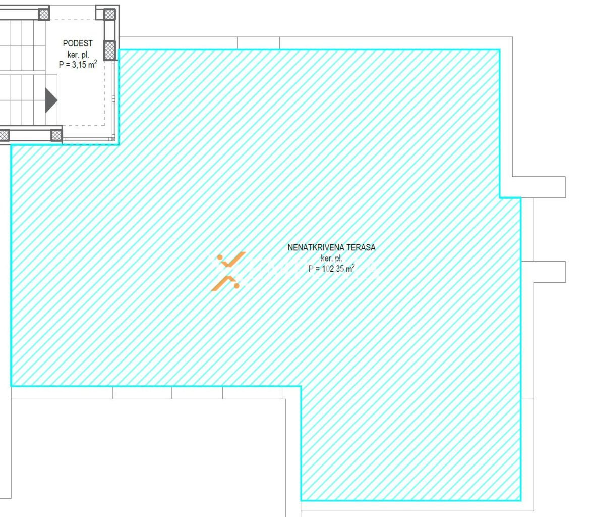 Die Wohnung besteht aus einem Flur, zwei Schlafzimmern, einem dritten Schlafzimmer mit eigenem Bad, einem zusätzlichen Badezimmer, einem Waschraum sowie einer Küche mit Ess- und Wohnzimmer. Vom Wohnbereich aus gelangt man auf die Loggia, während die großzügige Dachterrasse mit einer Fläche von 102,35 m² über das Treppenhaus zugänglich ist – ideal zum Genießen und Entspannen.