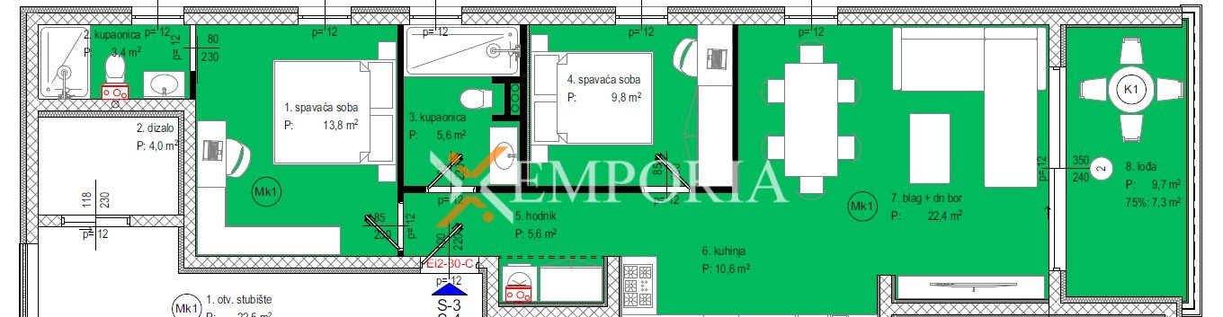 Die Wohnung befindet sich im ersten Stock des Gebäudes und verfügt über eine Nettofläche von 78,41 m². Die Raumaufteilung umfasst einen Flur, eine Küche mit Ess- und Wohnzimmer, zwei Schlafzimmer (eines mit eigenem Badezimmer), ein weiteres Badezimmer sowie eine Loggia.