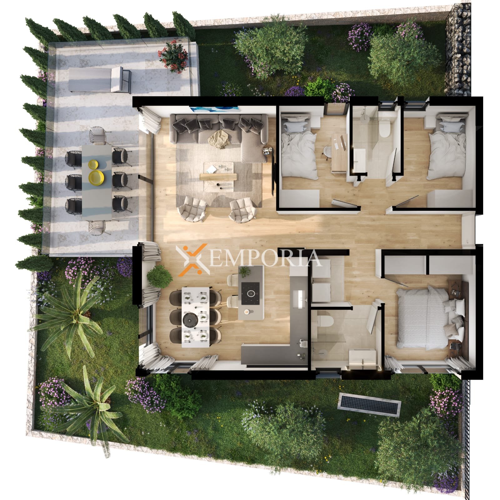 Die Raumaufteilung umfasst einen Flur, zwei Schlafzimmer, ein Hauptschlafzimmer mit eigenem Bad, ein weiteres Bad, eine Küche mit Essbereich und Wohnzimmer, einen Hauswirtschaftsraum sowie eine überdachte Terrasse. Die Netto-Wohnfläche beträgt 85,58 m².