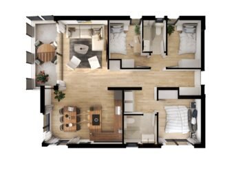 Die Raumaufteilung umfasst einen Flur, zwei Schlafzimmer, ein Hauptschlafzimmer mit eigenem Bad, ein weiteres Bad, eine Küche mit Essbereich und Wohnzimmer, einen Hauswirtschaftsraum sowie eine Loggia. Die Netto-Wohnfläche beträgt 84,54 m².