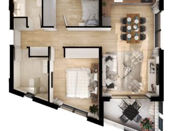 Die Raumaufteilung umfasst einen Flur, zwei Schlafzimmer, zwei Bäder, eine Küche mit Essbereich und Wohnzimmer sowie eine Loggia. Die Netto-Wohnfläche beträgt 67,94 m².