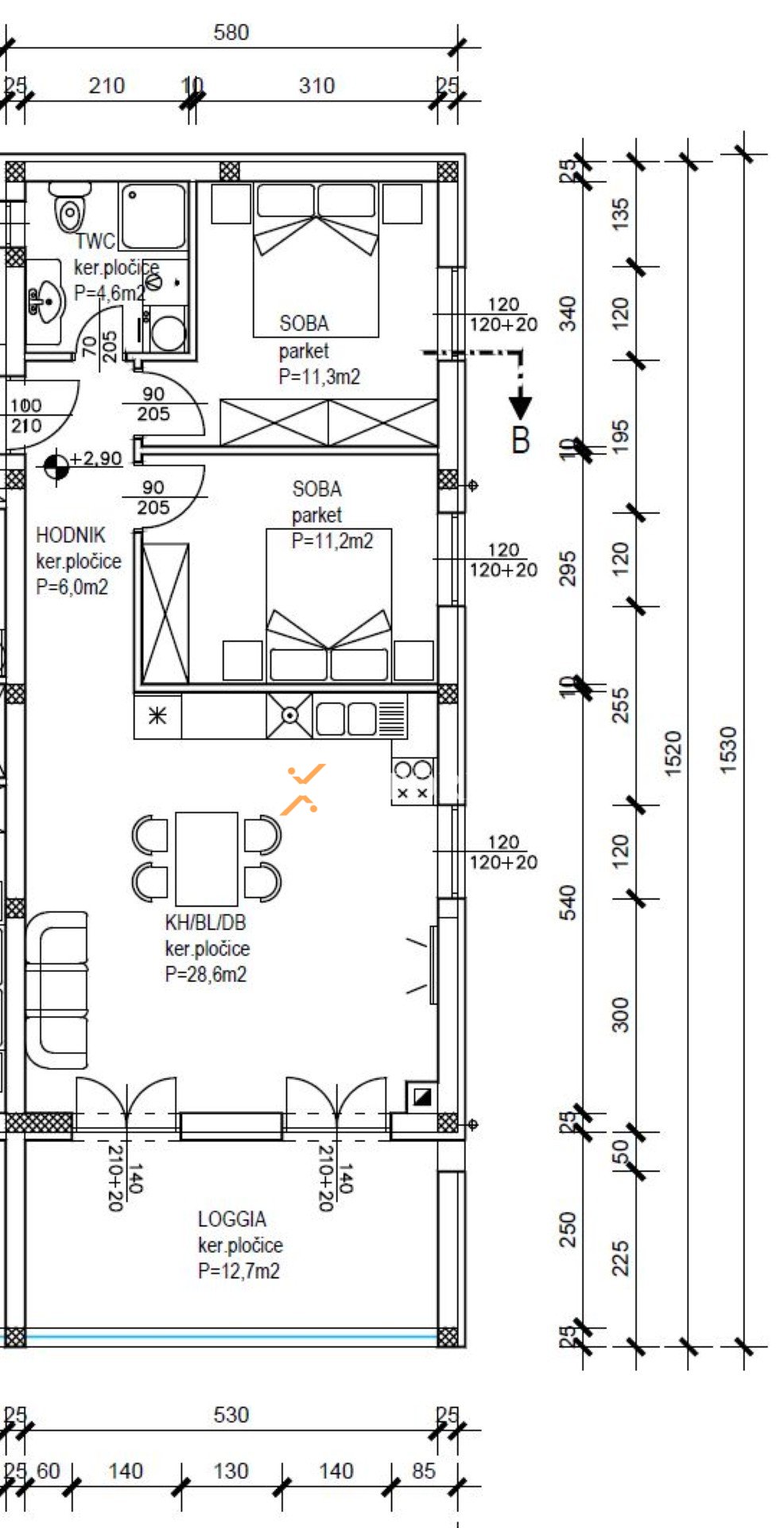 Die Wohnung hat eine gesamte Nettofläche von 82,44 m², einschließlich der Nebenflächen, während die reine Wohnfläche 71,22 m² beträgt. Der Grundriss umfasst einen Flur, zwei Schlafzimmer, ein Badezimmer, eine Küche mit Essbereich und Wohnzimmer sowie eine Loggia, die einen angenehmen Außenbereich zum Entspannen bietet. Dank des durchdachten Grundrisses und der südlichen Ausrichtung ist die Wohnung den ganzen Tag über hell und warm. Die Kombination aus Funktionalität und modernem Design macht sie ideal für Familien oder als attraktive Investition.