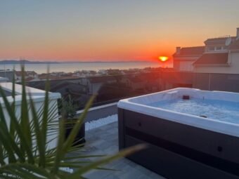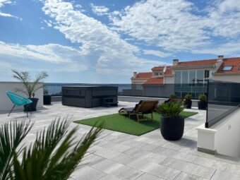 Von der Terrasse führen Stufen zur großzügigen Dachterrasse von 102,99 m², auf der sich ein Jacuzzi befindet.