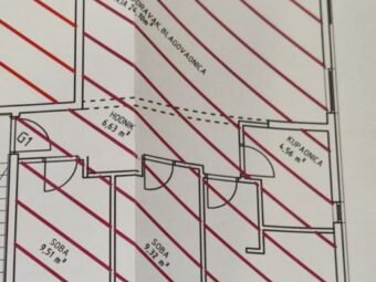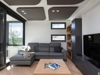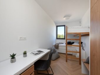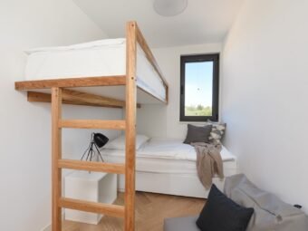 Der Innenbereich umfasst einen Flur, drei Schlafzimmer, ein Badezimmer sowie eine helle Küche mit Essbereich und Wohnzimmer mit Zugang zur Loggia. Die netto nutzbare Wohnfläche beträgt 70,43 m². Zur Wohnung gehören außerdem zwei Parkplätze – ein Außenstellplatz und eine Garage – sowie ein 28,71 m² großer Kellerraum mit WC, der als Spielzimmer eingerichtet ist und direkt mit der Garage verbunden ist. Die gesamte Nettofläche inklusive Nebenflächen beträgt 117,38 m².