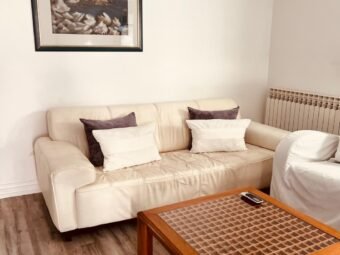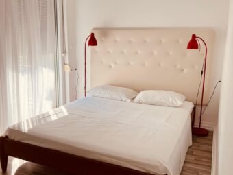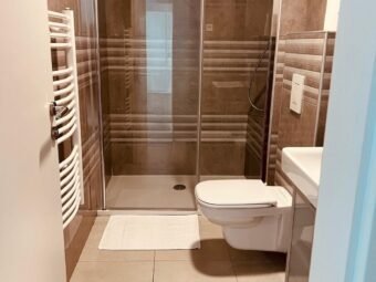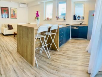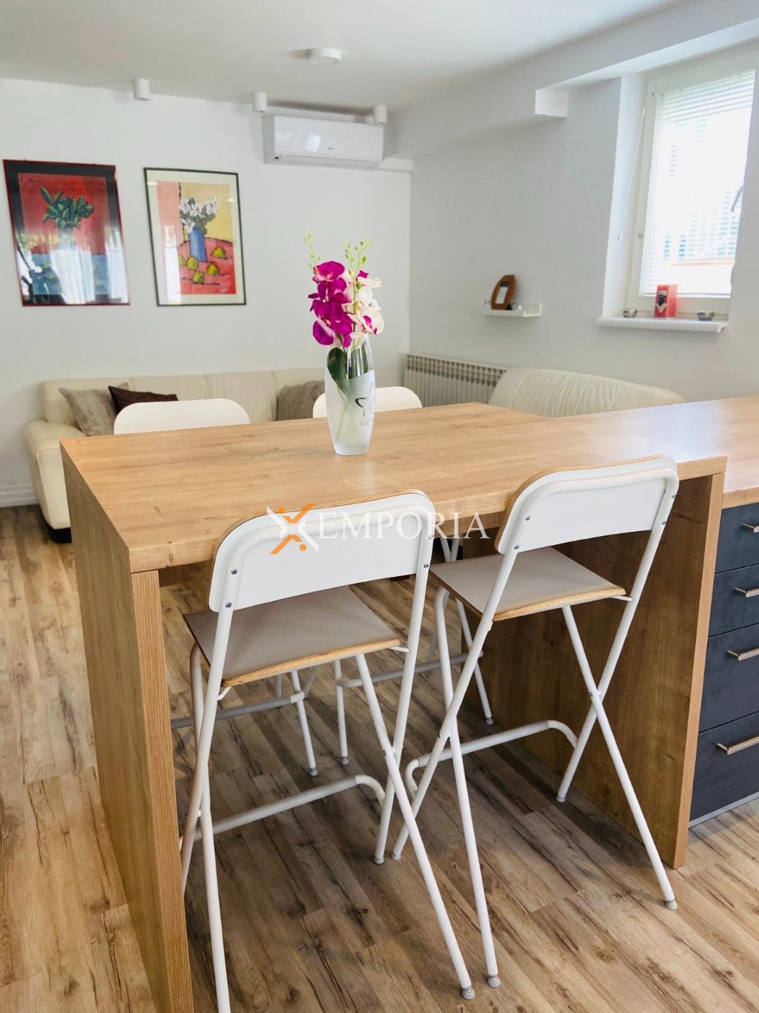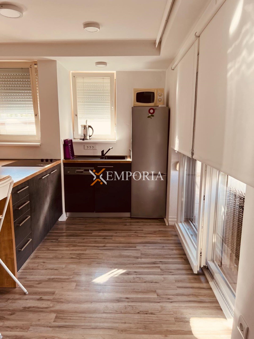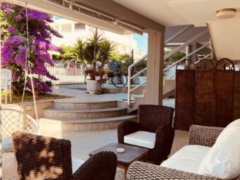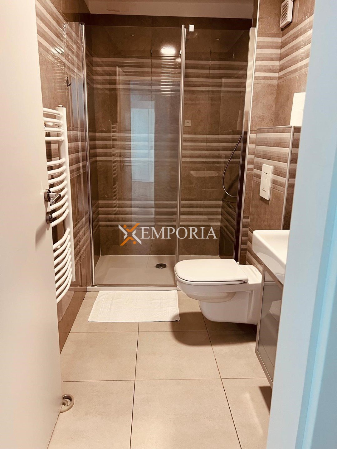 Die Wohnung wird möbliert verkauft. Eine elektrische Fußbodenheizung ist in der gesamten Wohnung installiert, zusätzlich steht eine Gaszentralheizung mit Heizkörpern zur Verfügung. Eine Klimaanlage befindet sich im Wohnbereich. Das Gebäude ist aus Ziegel gebaut, die Fassade ist mit 8 cm Styropor gedämmt. Die Fenster sind aus Holz, während die Glasfront aus PVC besteht, alle ausgestattet mit Rollläden. Die Böden sind mit Fliesen und Laminat versehen.