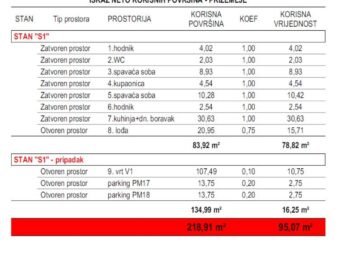 Die Wohnung befindet sich im Erdgeschoss und bietet einen funktionalen und modernen Grundriss. Sie besteht aus einem Eingangsbereich, zwei Schlafzimmern, einem Badezimmer, einem separaten WC, einer Küche mit Essbereich und Wohnzimmer sowie einer Loggia. Die Nettonutzfläche der beschriebenen Räume beträgt 78,82 m². Zusätzlich gehört ein privater Garten mit einer Fläche von 107,49 m² sowie zwei Parkplätze zur Wohnung. Die gesamte Nettonutzfläche inklusive Nebenflächen beträgt 95,07 m².