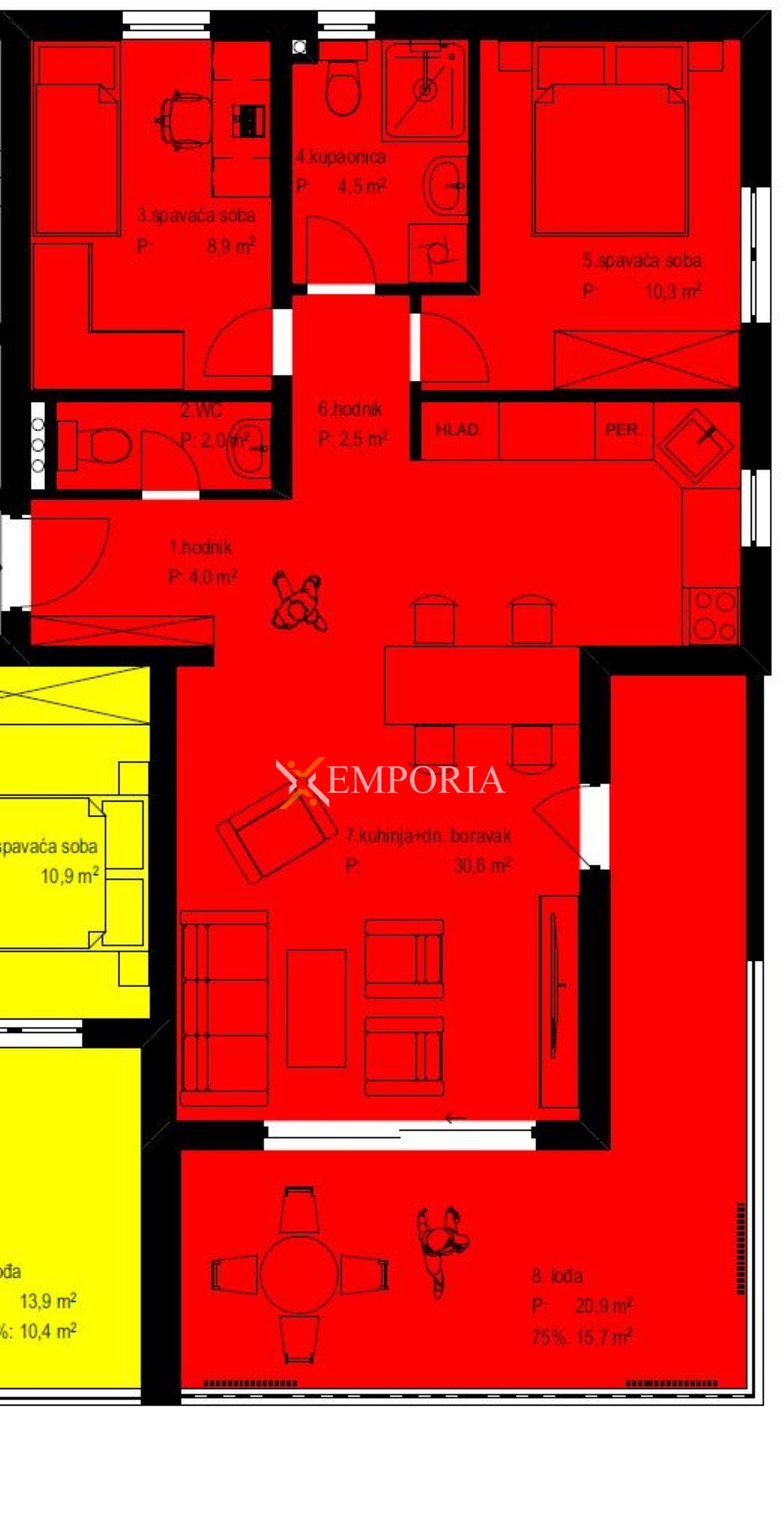 Crvene kuće ist ein ruhiges Stadtviertel im nördlichen Teil von Zadar, das hauptsächlich aus Einfamilienhäusern und einer Reihe von neuen Wohngebäuden besteht. Es ist weit genug von Hektik entfernt, und trotzdem dauert es nur etwa 10 Minuten Autofahrt, um das Stadtzentrum und genauso viel um den nächstgelegenen Strand zu erreichen. Deshalb ist dieser Stadtteil zum Wohnen wünschenswert.