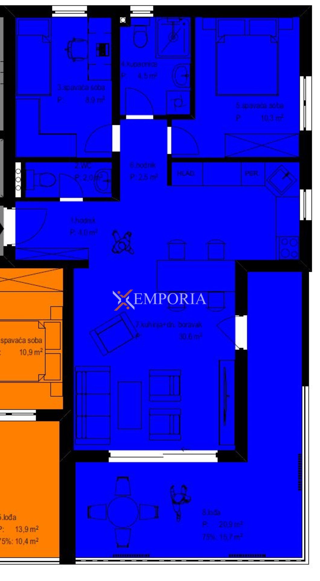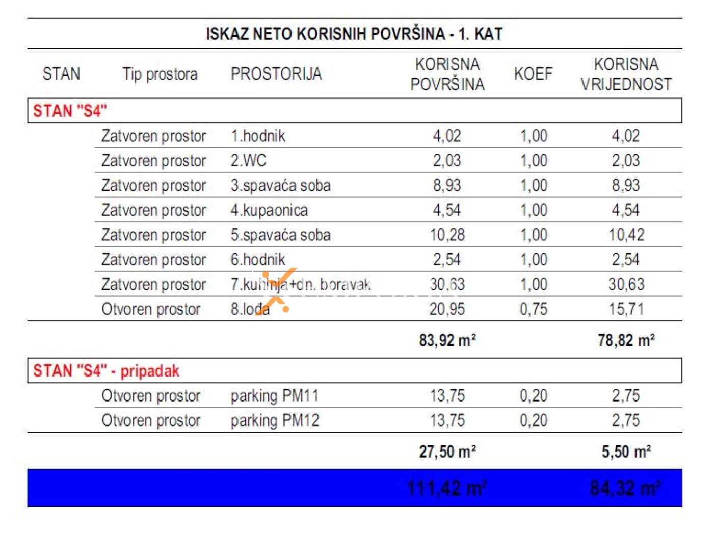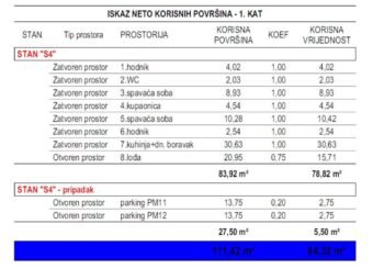 Die Wohnung verfügt über einen funktionalen und gut durchdachten Grundriss. Sie besteht aus einem Eingangsbereich, zwei Schlafzimmern, einem Badezimmer, einem separaten WC, einer Küche mit Essbereich und Wohnzimmer sowie einer Loggia. Die Nettonutzfläche der beschriebenen Räume beträgt 78,82 m². Zusätzlich gehören zwei Parkplätze zur Wohnung, was den Wohnkomfort deutlich erhöht. Die gesamte Nettonutzfläche inklusive Nebenflächen beträgt 84,32 m².