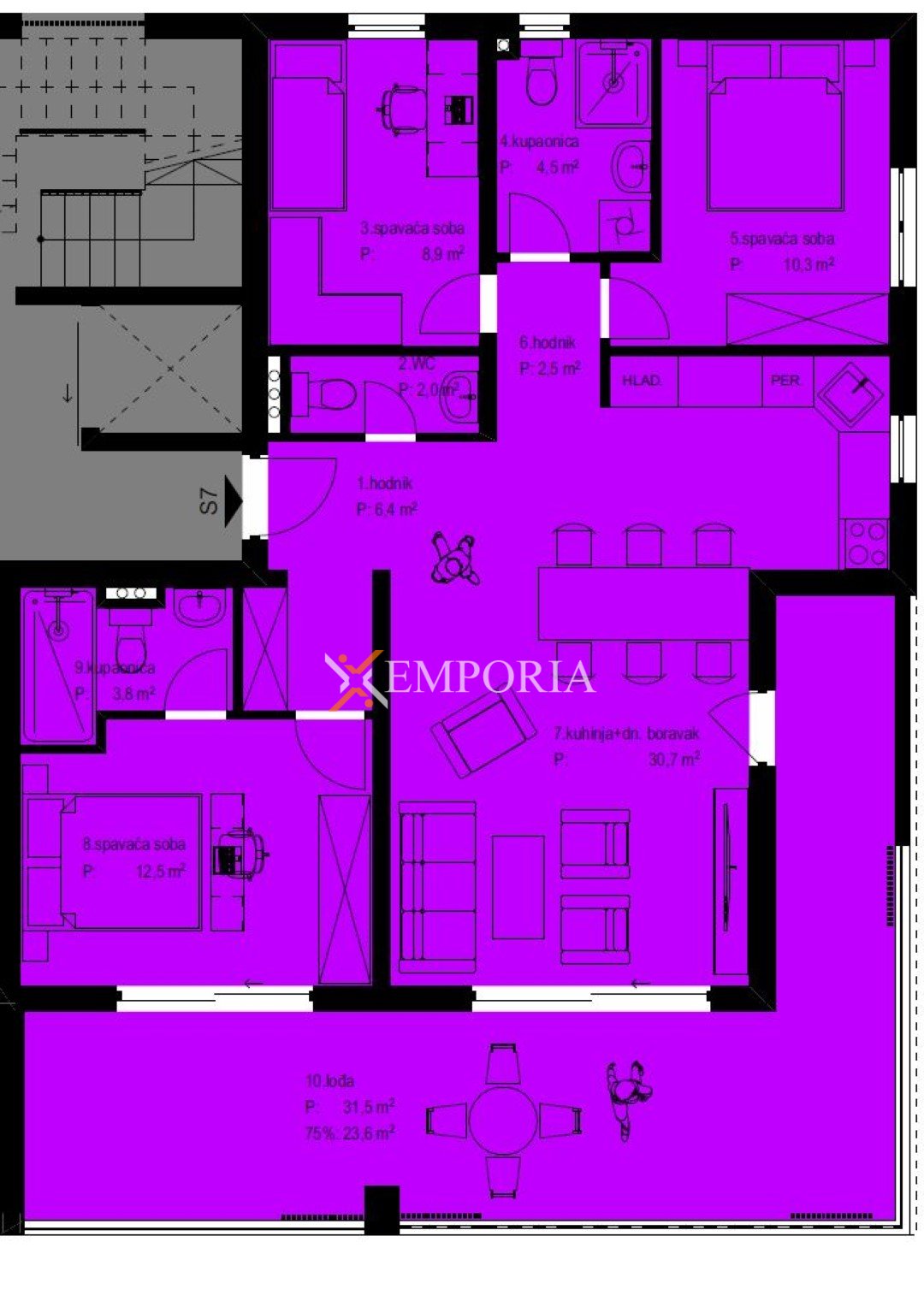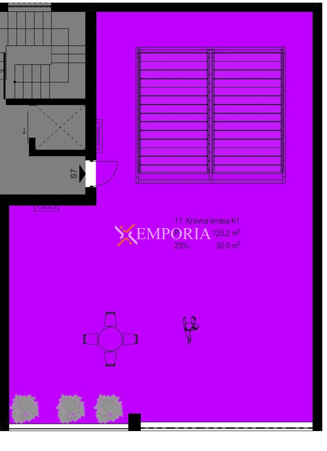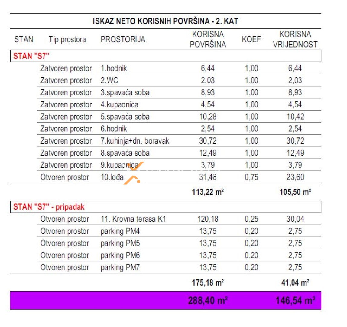 Das Penthouse befindet sich im zweiten Stock eines modernen Wohngebäudes und verfügt über einen großzügigen sowie funktionalen Grundriss. Es besteht aus einem Eingangsbereich, zwei Schlafzimmern, einem Schlafzimmer mit eigenem Badezimmer, einem weiteren Badezimmer, einem separaten WC, einer Küche mit Essbereich und Wohnzimmer sowie einer Loggia. Die Nettonutzfläche des Wohnbereichs beträgt 105,50 m². Über das Stiegenhaus gelangt man direkt auf die private Dachterrasse mit einer Fläche von 102,18 m², die idealen Raum für Entspannung und Aufenthalt im Freien bietet. Die gesamte Nettonutzfläche der beschriebenen Räume beträgt 135,54 m².