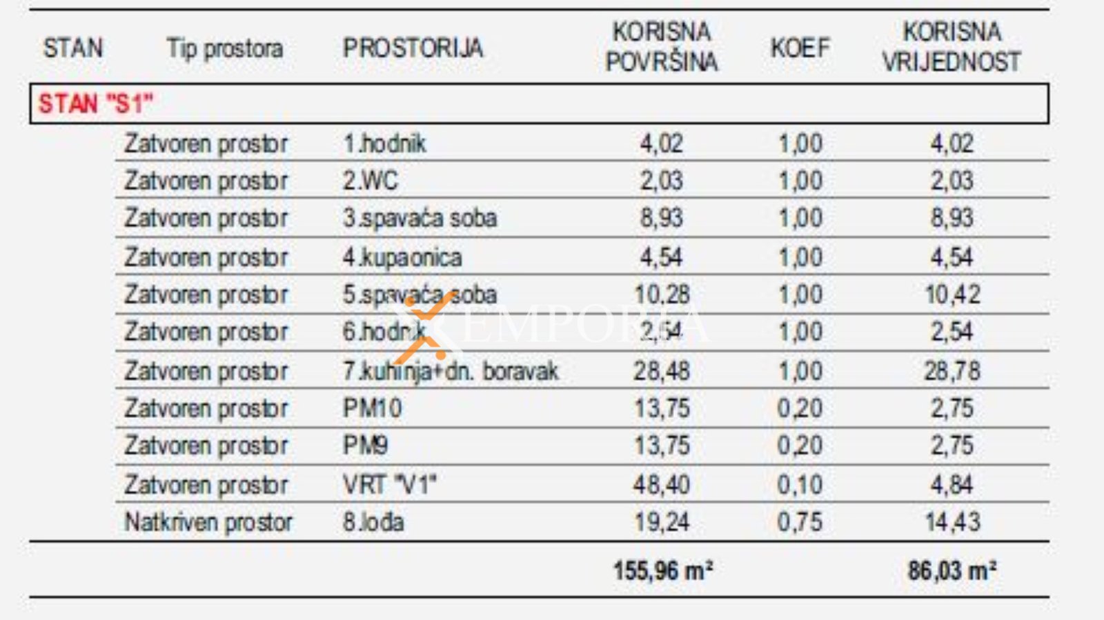 Die Raumaufteilung umfasst einen Flur, zwei Schlafzimmer, ein Badezimmer, ein separates WC, eine Küche mit Essbereich und Wohnzimmer im offenen Konzept sowie eine Loggia. Die Netto-Nutzfläche der beschriebenen Räume beträgt 75,69 m2. Zusätzlich gehört ein privater Garten mit einer Fläche von 48,40 m2 zur Wohnung, der zusätzlichen Außenbereich zum Entspannen bietet.