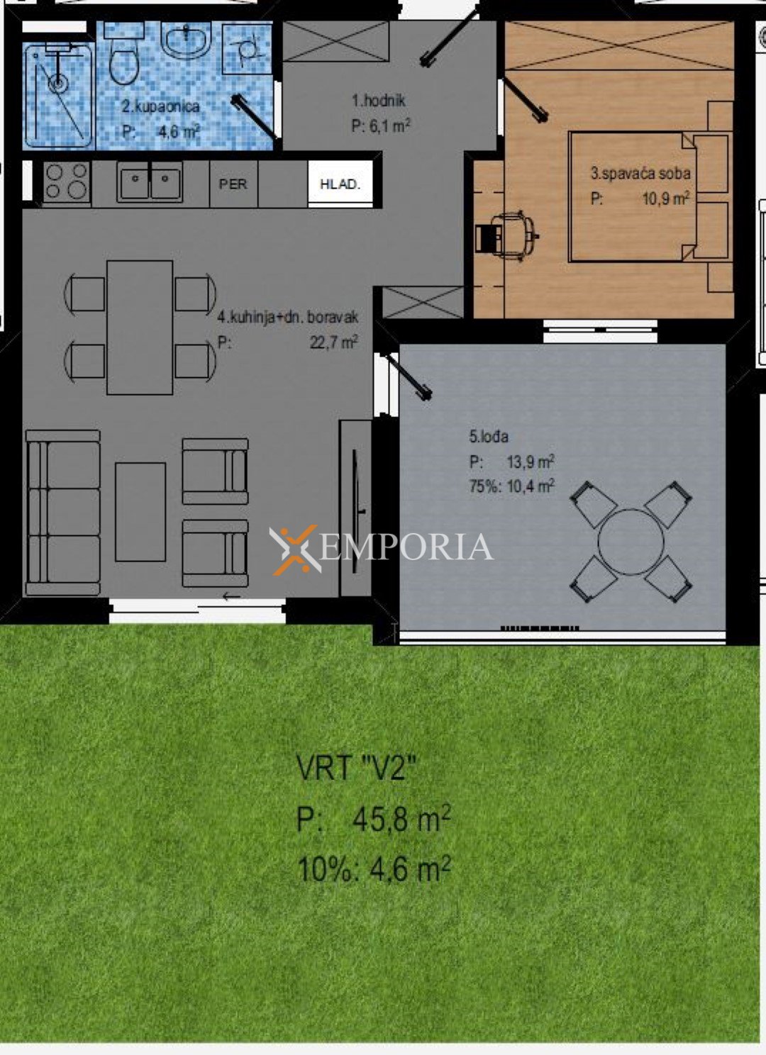 Die Raumaufteilung umfasst einen Flur, ein Schlafzimmer, ein Badezimmer, eine Küche mit Essbereich und Wohnzimmer im offenen Konzept sowie eine Loggia. Die Netto-Nutzfläche der beschriebenen Räume beträgt 54,74 m2. Zusätzlich gehört ein privater Garten mit einer Fläche von 45,84 m2 zur Wohnung, der zusätzlichen Außenbereich bietet.