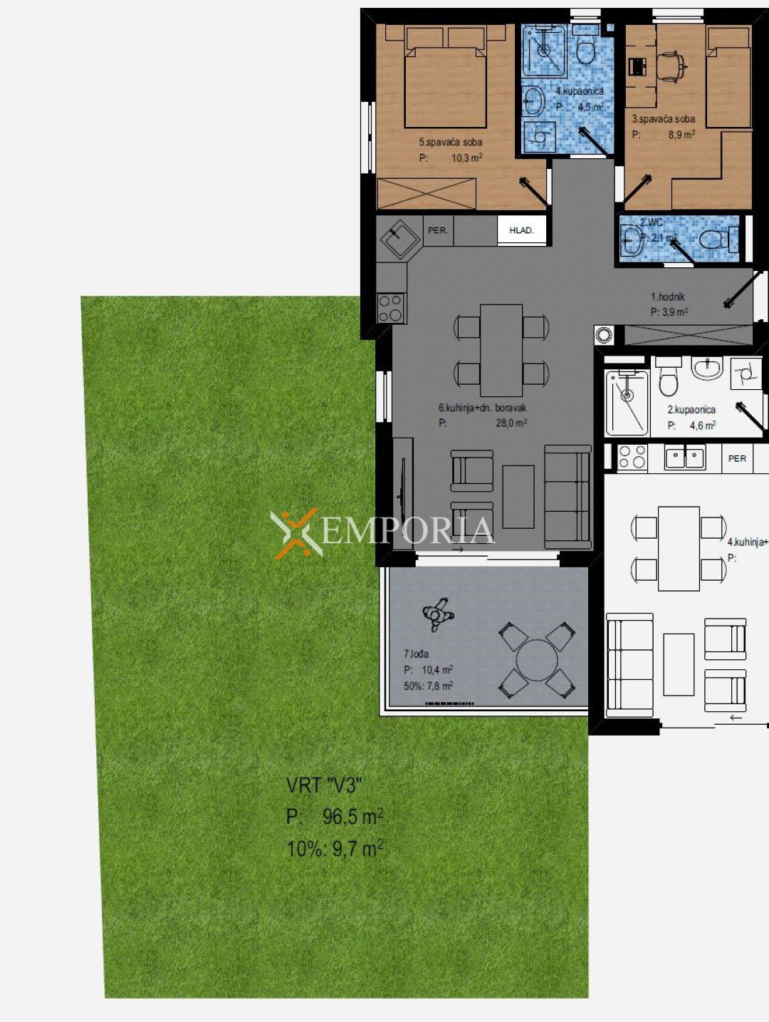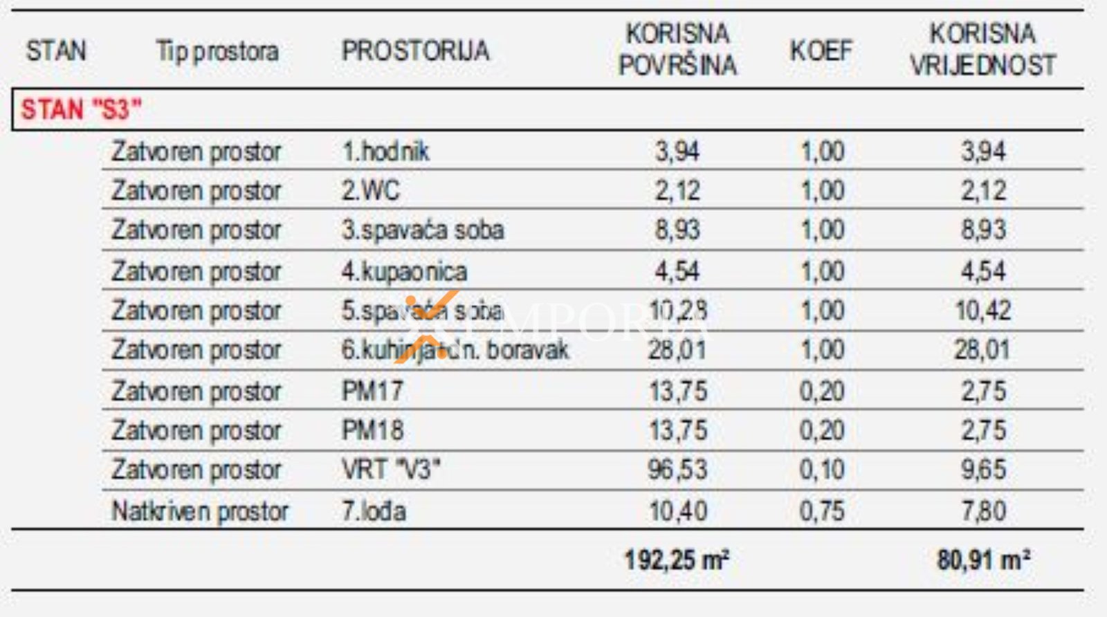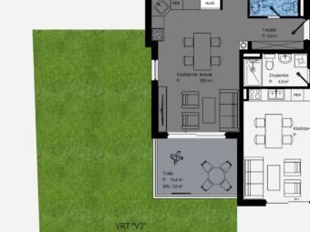 Die Raumaufteilung umfasst einen Flur, zwei Schlafzimmer, ein Badezimmer, ein separates WC, eine Küche mit Essbereich und Wohnzimmer im offenen Konzept sowie eine Loggia. Die Netto-Nutzfläche der beschriebenen Räume beträgt 65,76 m2. Zusätzlich gehört ein großzügiger privater Garten mit einer Fläche von 96,53 m2 zur Wohnung, der viel Platz im Außenbereich bietet.