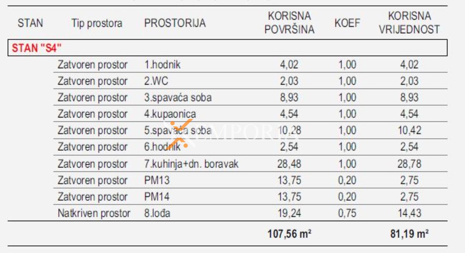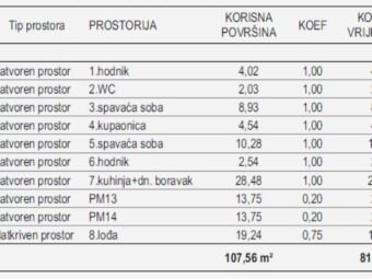 Die Raumaufteilung umfasst einen Flur, zwei Schlafzimmer, ein Badezimmer, ein separates WC, eine Küche mit Essbereich und Wohnzimmer im offenen Konzept sowie eine Loggia. Die Netto-Nutzfläche der beschriebenen Räume beträgt 75,69 m2. Die gesamte Nettofläche inklusive Nebenflächen beträgt 81,19 m2.
