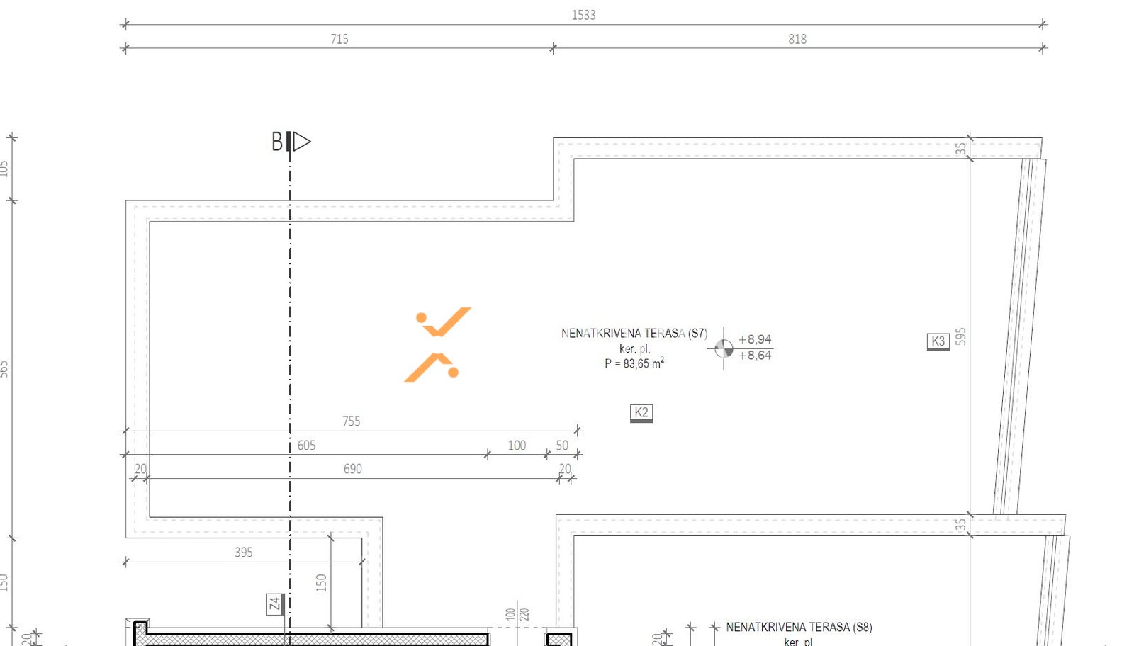 Die Wohnung besteht aus Flur, 2 Schlafzimmern, Waschküche/WC, Badezimmer, Küche mit Essbereich und Wohnzimmer sowie Loggia (77,13 m2 netto), vom Treppenhaus führt sie zur Dachterrasse von 83,65 m2. Die Nettonutzfläche der beschriebenen Räume beträgt 98,04 m2. Zusätzlich gehören 2 Parkplätze und ein Abstellraum im Untergeschoss zur Wohnung.